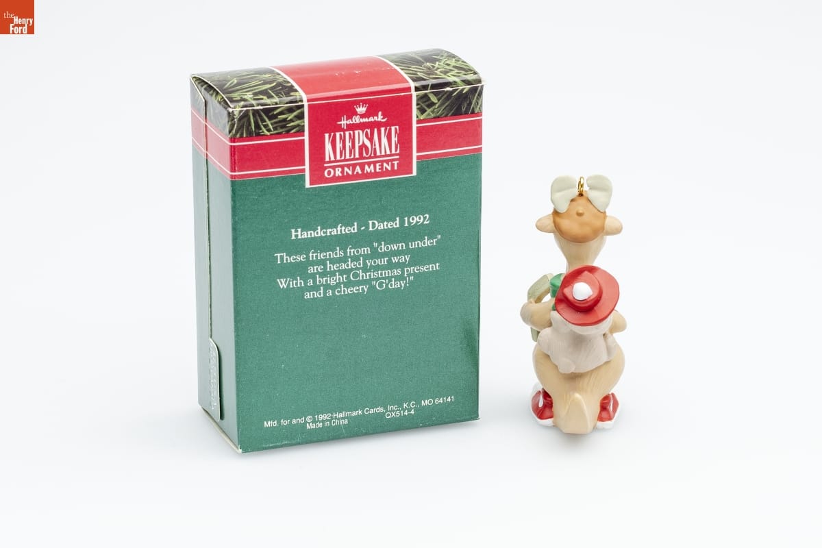 Hallmark / KEEPSAKE / ORNAMENT / Handcrafted - Dated 1992 / These friends from "down-under" / are headed your way / With a bright Christmas present / and a cheery "G'day!" / Mfd. for and (C) 1992 Hallmark Cards, Inc., K.C., MO 64141 / Made in China QX514-4