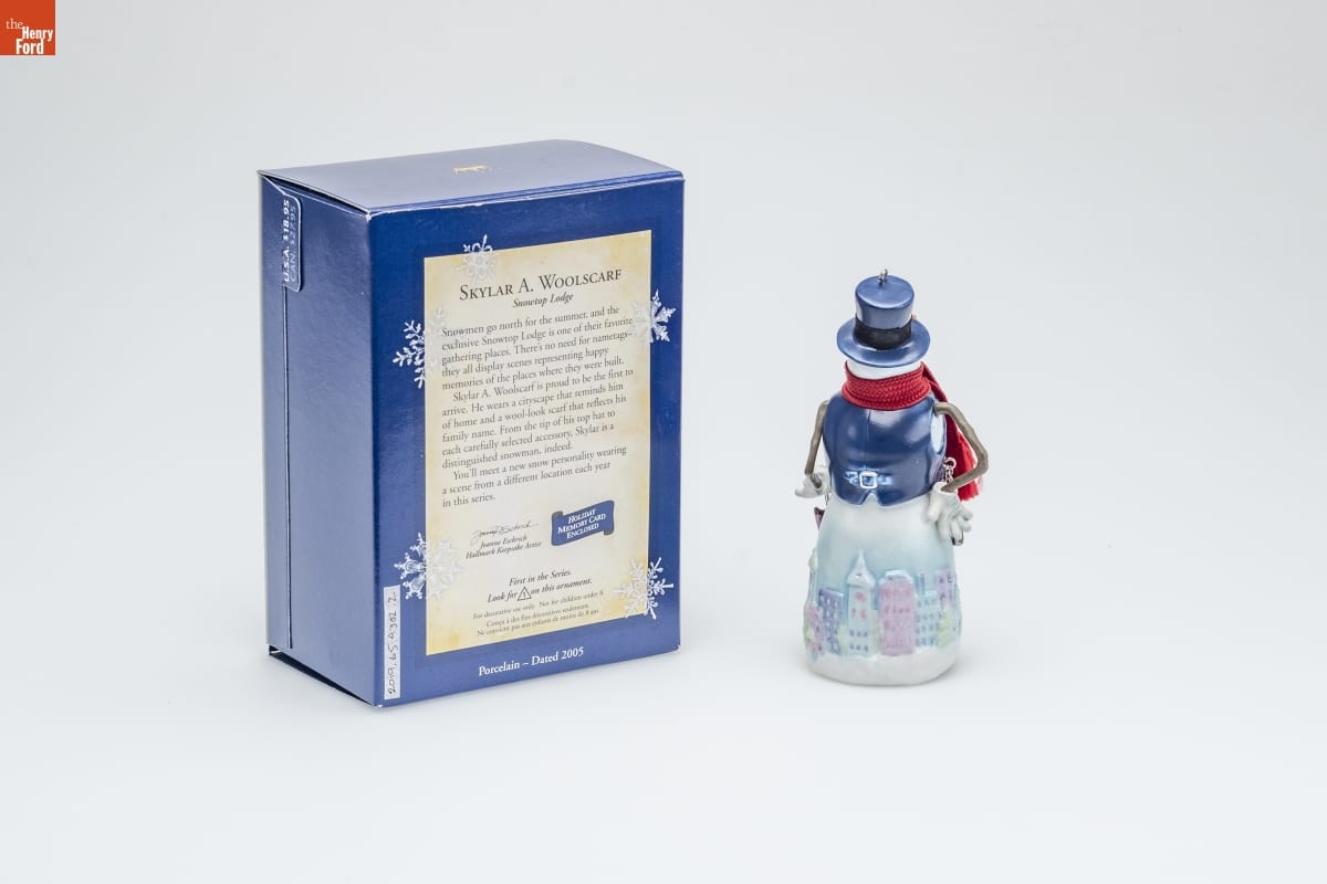SKYLAR A. WOOLSCARF / Snowtop Lodge / Snowmen go north for the summer, and the / exclusive Snowtop Lodge is one of their favorite / gathering places. There's no need for nametags- / they all display scenes representing happy / memories of the places where they were built. / Skylar A. Woolscarf is proud to be the first to / arrive. He wears a cityscape that reminds him / of home and a wool-look scarf that reflects his / family name. From the tip of his top hat to / each carefully selected accessory, Skylar is a / distinguished snowman, indeed. / You'll meet a new snow personality wearing / a scene from a different location each year of this series. / Joanne Eschrich / Hallmark Keepsake Artist / HOLIDAY / MEMORY CARD / ENCLOSED / First in the Series. / Look for 1 on this ornament. / For decorative use only. Not for children under 8. / Concu a des fins decoratives seulement. / Ne convient pas aux enfants de moins de 8 ans. / Porcelain - Dated 2005