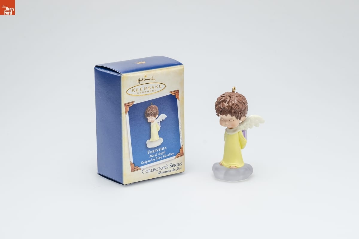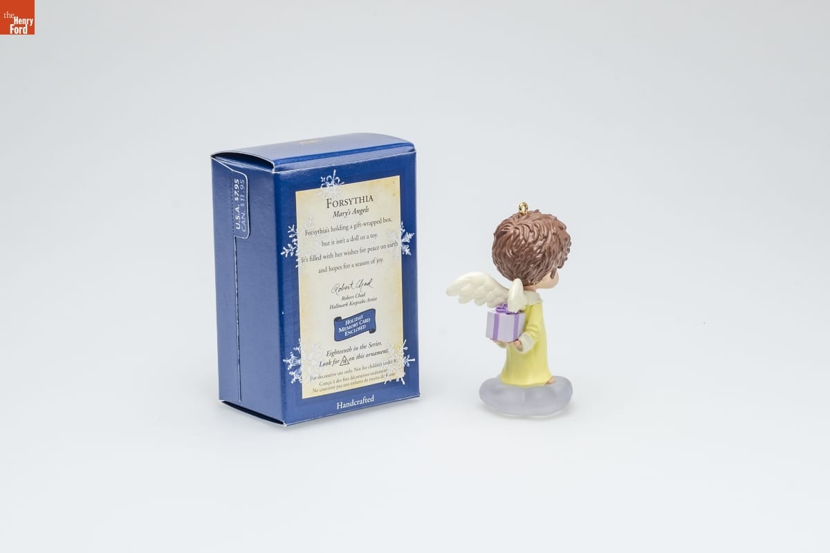 FORSYTHIA / Mary's Angels / Forsythia holds a gift-wrapped box, / but it isn't a doll or a toy. / It's filled with her wishes for peace on earth / and hopes for a season of joy. / Robert Chad / Hallmark Keepsake Artist / HOLIDAY / MEMORY CARD / ENCLOSED / Eighteenth in the Series. / Look for 18 on this ornament. / For decorative use only. Not for children under 8. / Concu a des fins decoratives seulement. / Ne convient pas aux enfants de moins de 8 ans. / Handcrafted