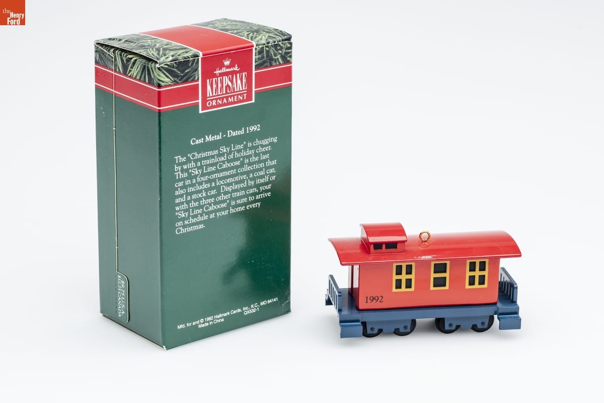 Hallmark / KEEPSAKE / ORNAMENT / Cast Metal - Dated 1992 / The "Christmas Sky Line" is chugging / by with a trainload of holiday cheer. / This "Sky Line Caboose" is the last / car in a four-ornament collection that / also includes a locomotive, a coal car, / and a stock car. Displayed by itself or / with the three other train cars, your / "Sky Line Caboose" is sure to arrive / on schedule at your home every / Christmas. / Mfd. for and (C) 1992 Hallmark Cards, Inc., K.C., MO 64141 / Made in China QX532-1