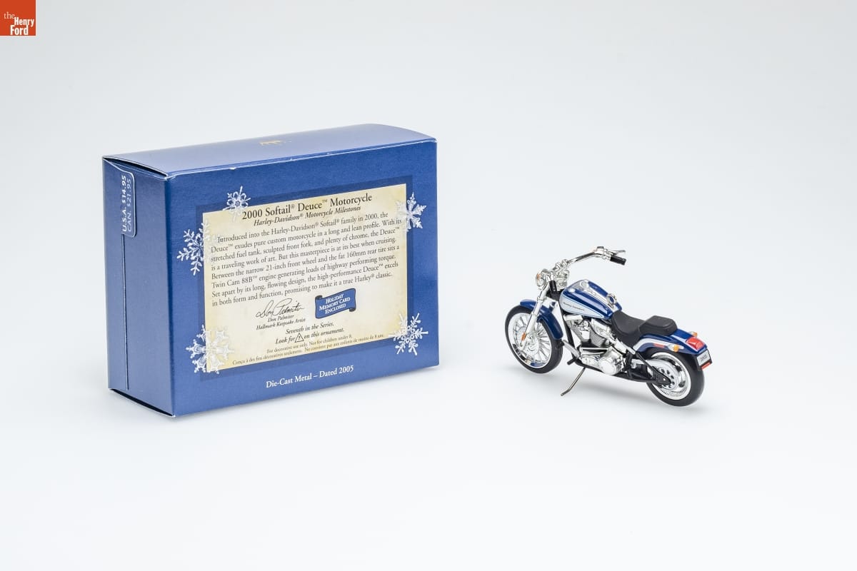 2000 Softail [R] Deuce [TM] Motorcycle / Harley-Davidson [R] Motorcycle Milestones / Introduced into the Harley-Davidson Softail [R] family in 2000, the / Deuce [TM] exudes pure custom motorcycle in a long and lean profile. With its / stretched fuel tank, sculpted front fork, and plenty of chrome, the Deuce [TM] / is a traveling work of art. But this masterpiece is at its best when cruising. / Between the narrow 21-inch front wheel and the fat 160mm rear tire sits a / Twin Cam 88B [TM] engine generating loads of highway performing torque. / Set apart by its long, flowing design, the high-performance Deuce [TM] excels / in both form and funciton, promising to make it a true Harley [R] classic. / Don Palmiter/ Hallmark Keepsake Artist / HOLIDAY / MEMORY CARD / ENCLOSED / Seventh in the Series. / Look for 7 on this ornament. / For decorative use only. Not for children under 8. / Concu a des fins decoratives seulement. Ne convient pas aux enfants de moins de 8 ans. / Die-Cast Metal - Dated 2005