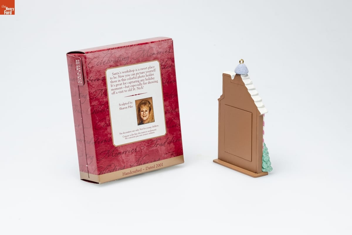 Santa's workshop is a sweet place / to be. Now you can picture yourself / there in this colorful photo holder. / It 's great for capturing any holiday / moment--but especially for showing / off a visit to old St. Nick! / Sculpted by / Sharon Pike / For decorative use only. Not for young children. / Concue a des fins decoratives seulement. / Ne convient pas aux jeunes enfants. / Handcrafted - Dated 2001