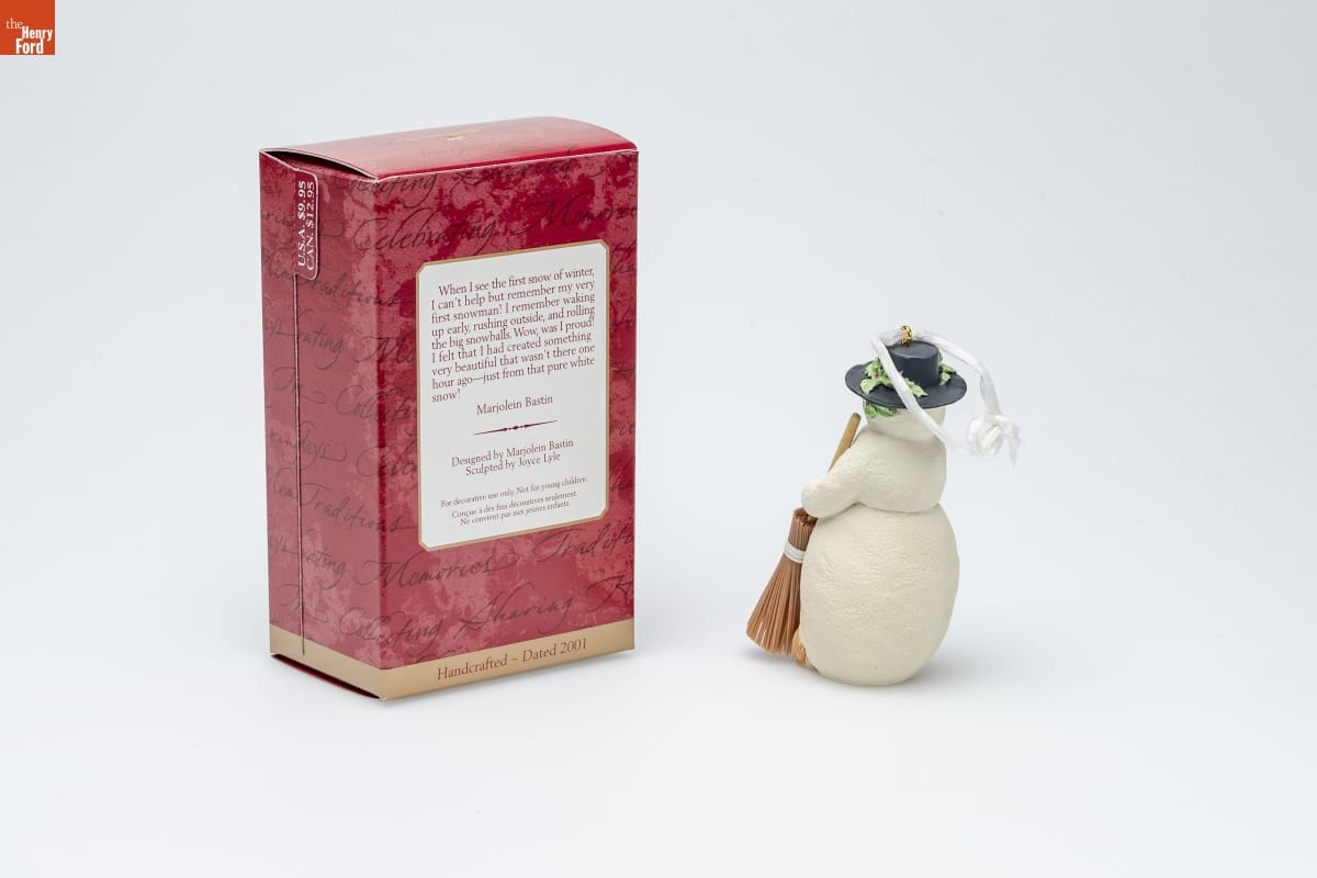 When I see the first snow of winter, / I can't help but remember my very / first snowman! I remember waking / up early, rushing outside, and rolling / the big snowballs. Wow, was I proud! / I felt that I had created something / very beautiful that wasn't there one / hour ago--just from that pure white / snow! / Marjolein Bastin / Designed by Marjolein Bastin / Sculpted by Joyce Lyle / For decorative use only. Not for young children. / Concue a des fins decoratives seulement. / Ne convient pas aux jeunes enfants. / Handcrafted - Dated 2001