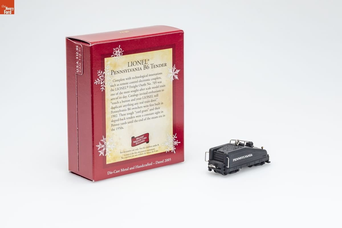 LIONEL [R] / PENNSYLVANIA B6 TENDER / Complete with technological innovations / such as remote control electronic couplers, / the LIONEL [R] Freight Outfit No. 705 was / one of the most sought-after scale model train / sets of its day. Catalogs invited enthusiasts to / "touch a button and your LIONEL will / duplicate anything any real train does!" / Pennsylvania B6 switchers were first built in / 1902. These tough "yard goats" and their / slope-back tenders were a constant sight in / Pennsy yards until the end of the steam era in / the 1950s. / HOLIDAY / MEMORY CARD / ENCLOSED / For decorative use only. Not for children under 8. / Concu a des fins decoratives seulement. / Ne convient pas aux enfants de moins de 8 ans. / Die-Cast Metal and Handcrafted - Dated 2005