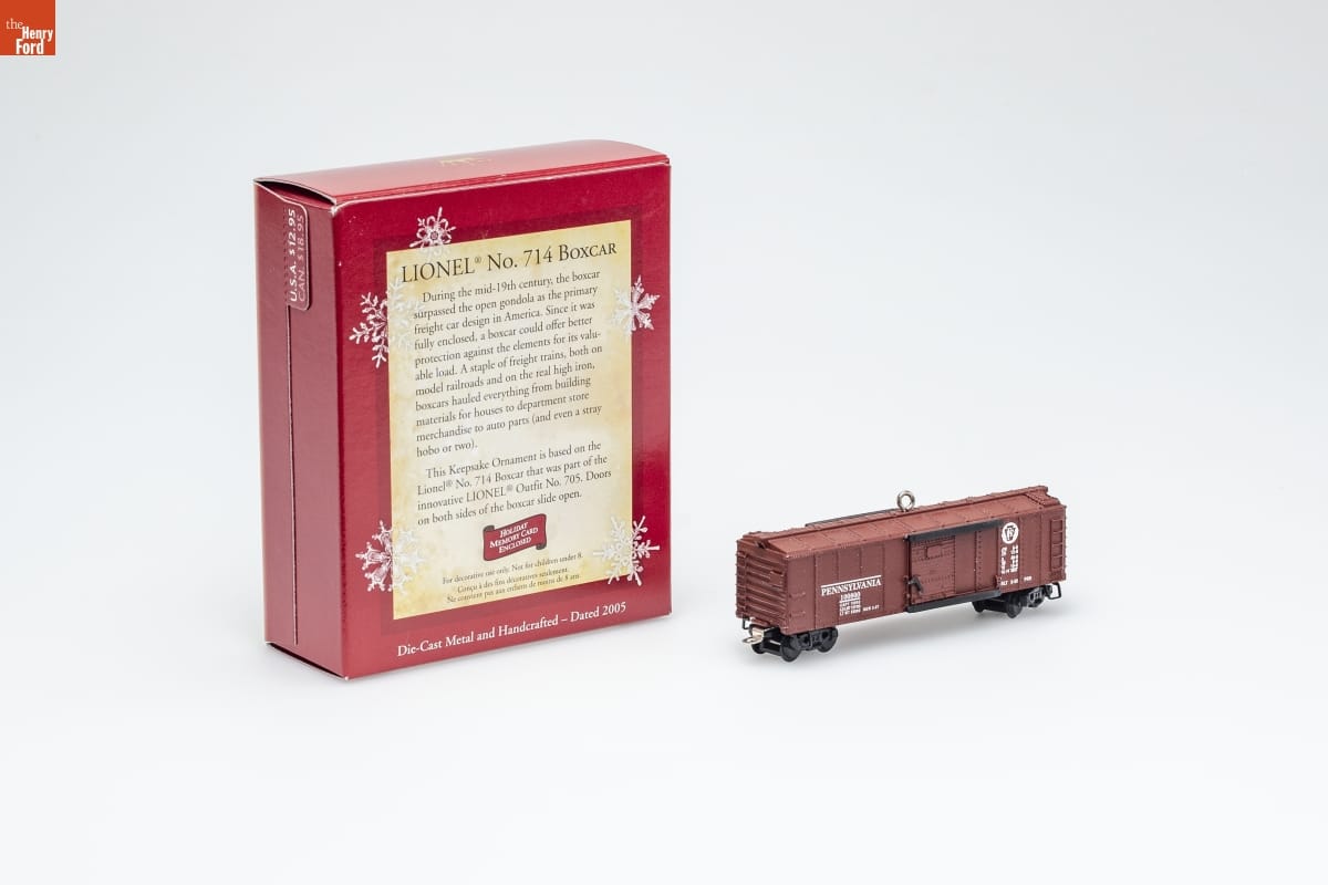 LIONEL [R] No. 714 BOXCAR / During the mid-19th century, the boxcar / surpassed the open gondola as the primary / freight car design in America. Since it was / fully enclosed, a boxcar could offer better / protection against the elements for its valu- / able load. A staple of freight trains, both on / model railroads and on the real high iron, / boxcars hauled everything from building / materials for houses to department store / merchandise to auto parts (and even a stray / hobo or two). / This Keepsake Ornament is based on the / Lionel [R] No. 714 Boxcar that was part of the / innovative LIONEL [R] Outfit No. 705. Doors / on both sides of the boxcar slide open. / HOLIDAY / MEMORY CARD / ENCLOSED / For decorative use only. Not for children under 8. / Concu a des fins decoratives seulement. / Ne convient pas aux enfants de moins de 8 ans. / Die-Cast Metal and Handcrafted - Dated 2005
