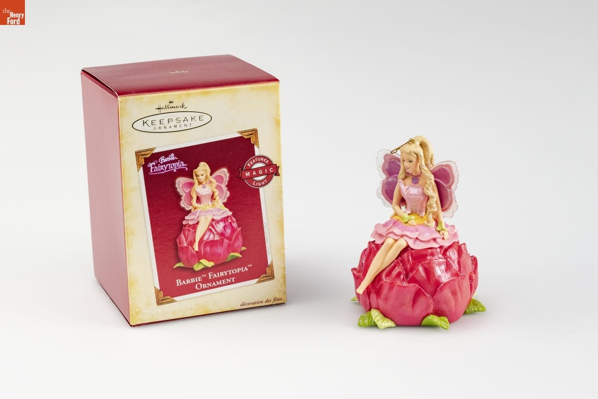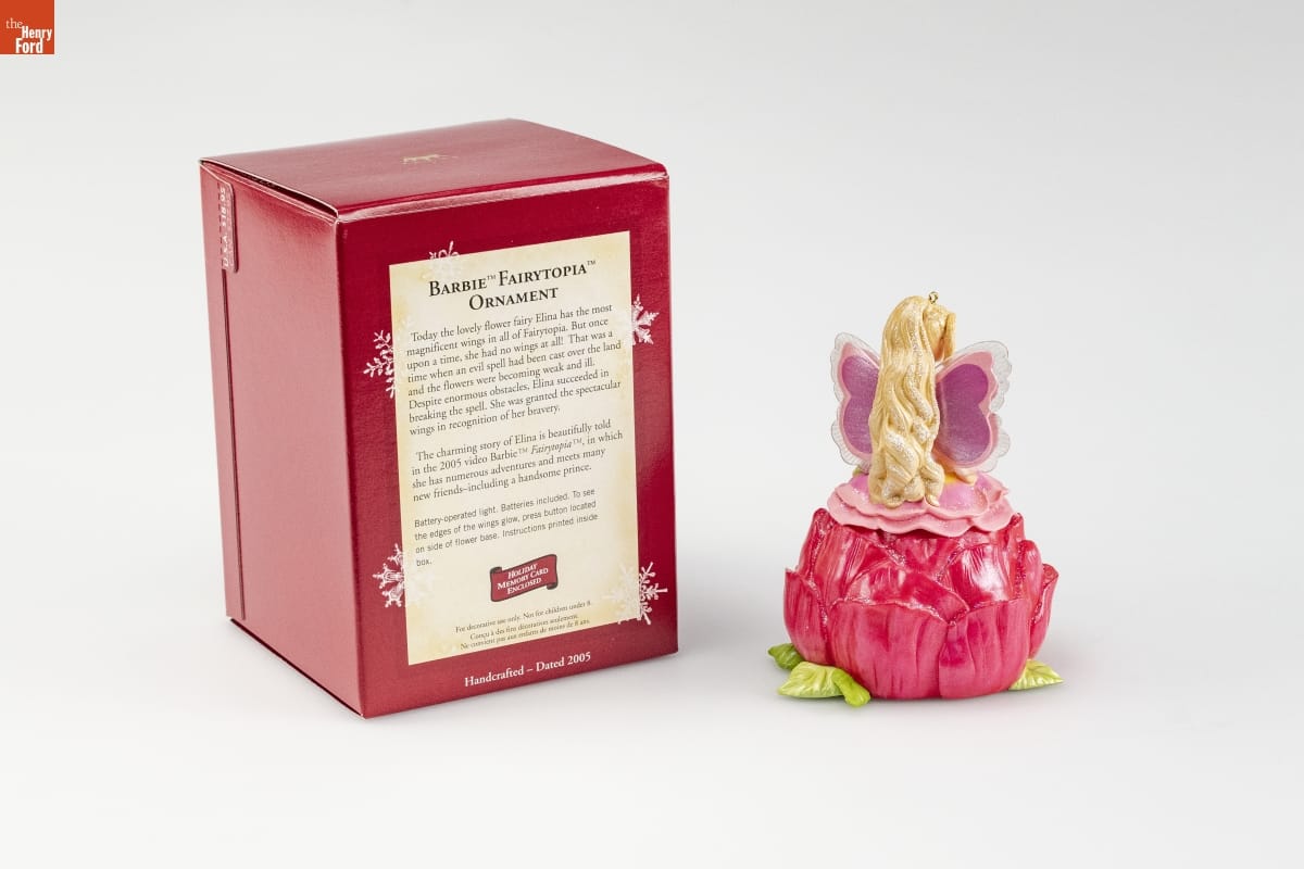 BARBIE [TM] FAIRYTOPIA [TM] / ORNAMENT / Today the lovely flower fairy Elina has the most / magnificent wings in all of Fairytopia. But once / upon a time, she had no wings at all! That was a / time when an evil spell had been cast over the land / and the flowers were becoming weak and ill. / Despite enormous obstacles, Elina succeeded in / breaking the spell. She was granted the spectacular / wings in recognition of her bravery. / The charming story of Elina is beautifully told / in the 2005 video Barbie [TM] Fairytopia [TM], in which / she has numerous adventures and meets many / new friends - including a handsome prince. / Battery-operated light. Batteries included. To see / the edges of the wings glow, press button located / on side of flower base. Instructions printed inside / box. / HOLIDAY / MEMORY CARD / ENCLOSED / For decorative use only. Not for children under 8. / Concu a des fins decoratives seulement. / Ne convient pas aux enfants de moins de 8 ans. / Handcrafted - Dated 2005