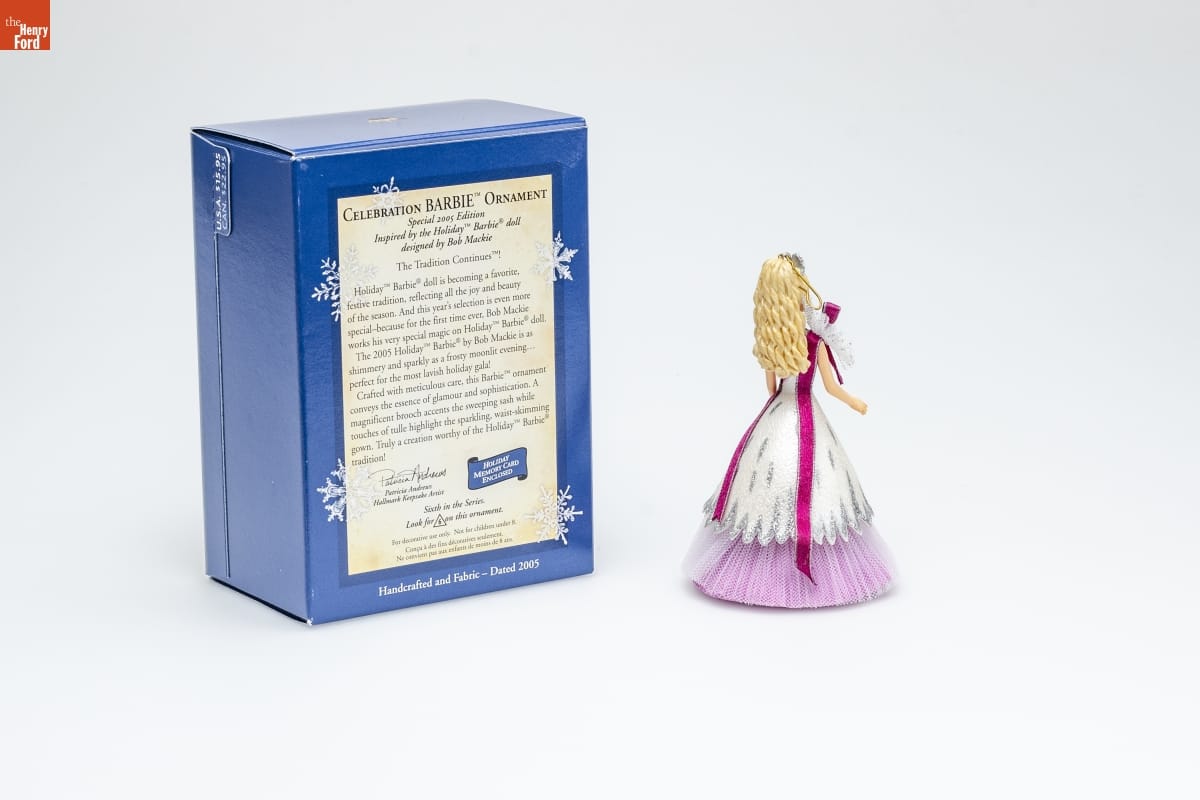 CELEBRATION BARBIE [TM] ORNAMENT / Special 2005 Edition / Inspired by the Holiday [TM] Barbie [R] doll / designed by Bob Mackie / The Tradition Continues [TM]! / Holiday[TM] Barbie[R] doll is becoming a favorite, / festive tradition. And this year's selection is even more / special - because for the first time ever, Bob Mackie / works his very special magic on Holiday [TM] Barbie [R] doll. / The 2005 Holiday [TM] Barbie [R] by Bob Mackie is as / shimmery and sparkly as a frosty moonlit evening... / perfect for the most lavish holiday gala! / Crafted with meticulous care, the Barbie [TM] ornament conveys the essence of glamour and sophistication. A / magnificent brooch accents the sweeping sash while / touches of tulle highlight the sparkling, waist-skimming / gown. Truly a creation worthy of the Holiday [TM] Barbie [R] / tradition! / Patricia Andrews / Hallmark Keepsake Artist / HOLIDAY / MEMORY CARD / ENCLOSED / Sixth in the Series. / Look for 6 on this ornament. / For decorative use only. Not for children under 8. / Concu a des fins decoratives seulement. / Ne convient pas aux enfants de moins de 8 ans. / Handcrafted and Fabric - Dated 2005