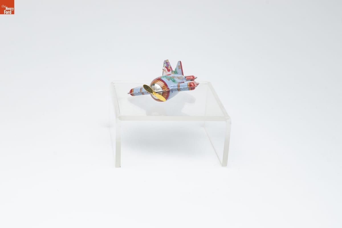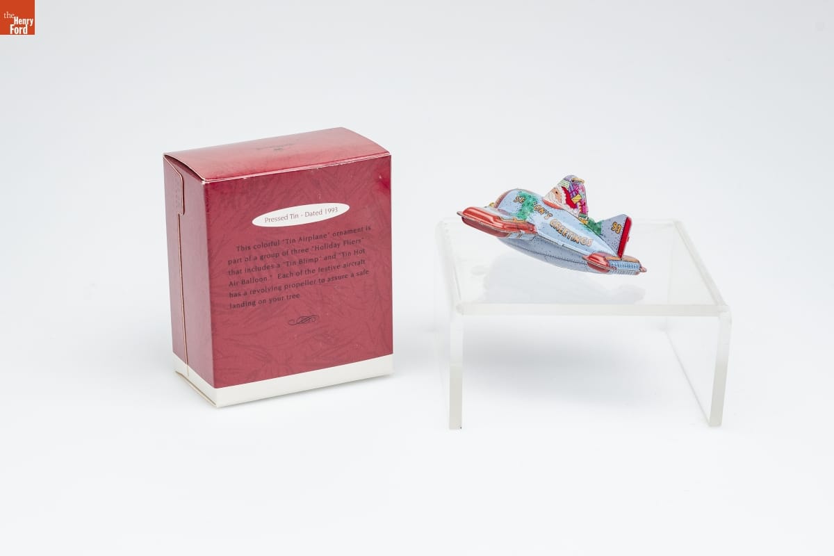 Pressed Tin - Dated 1993 / This colorful "Tin Airplane" ornament is / part of a group of three "Holiday Fliers" / that includes a "Tin Blimp" and "Tin Hot / Air Balloon." Each of these festive aircraft / has a revolving propeller to assure a safe / landing on your tree.