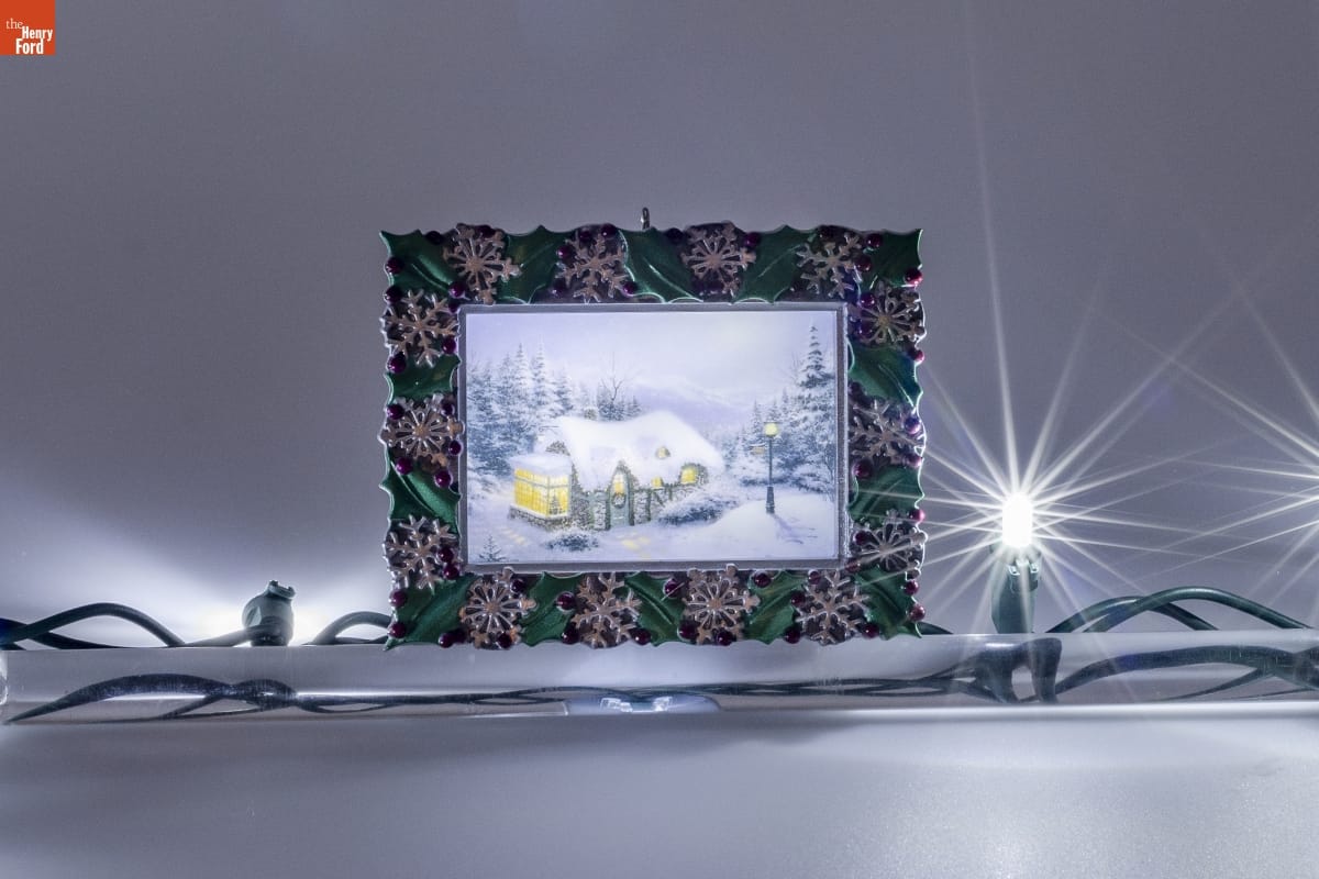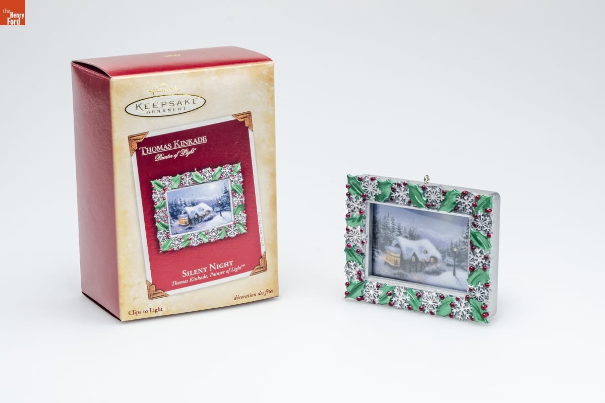 Original artwork by Thomas Kinkade. Ornament designed by Hallmark Cards, Inc. in Kansas City, Missouri. Made in China.