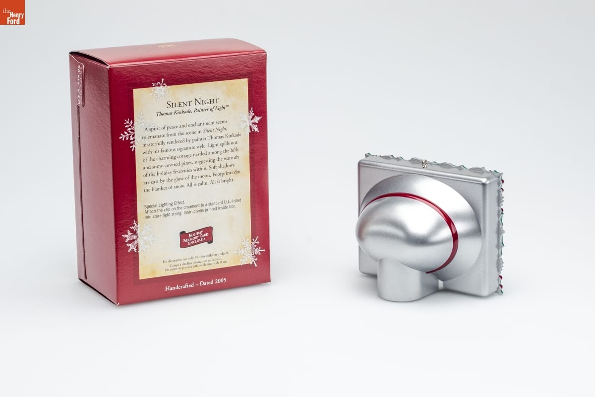 SILENT NIGHT / Thomas Kinkade, Painter of Light TM / A spirit of peace and enchantment seems / to emanate from the scene in Silent Night, / masterfully tendered by painter Thomas Kinkade / with his famous signature style. Light spills out / of the charming cottage nestled among the hills / and snow-covered pines, suggesting the warmth / of the holiday festivities within. Soft shadows / are cast by the glow of the moon. Footprints dot / the blanket of snow. All is calm. All is bright. / Special Lighting Effect. / Attach the clip on the ornament to a standard U.L.-listed / miniature light string. Instructions printed inside box. / HOLIDAY / MEMORY CARD / ENCLOSED / For decorative use only. Not for children under 8. / Concu a des fins decoratives seulement. / Ne convient pas aux enfants de moins de 8 ans. / Handcrafted - Dated 2005