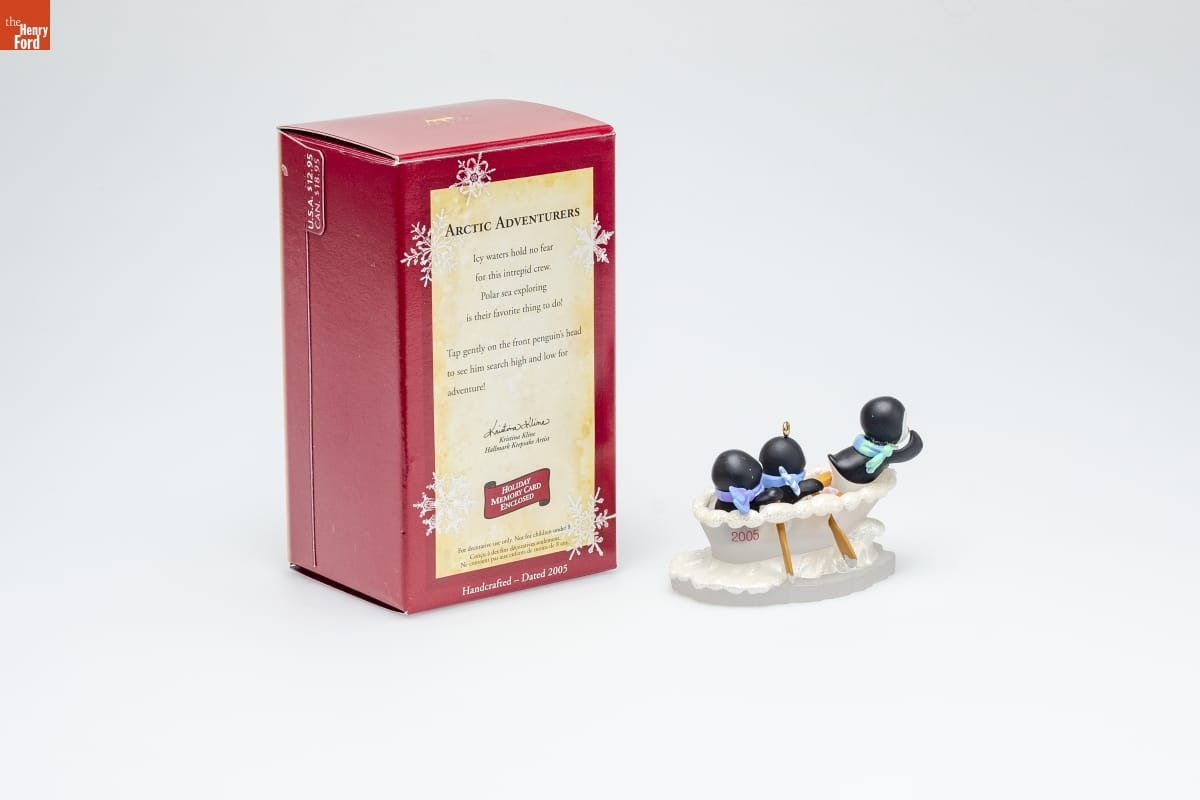 ARCTIC ADVENTURERS / Icy waters hold no fear / for this intrepid crew. / Polar sea exploring / is their favorite thing to do! / Tap gently on the front penguin's head / to see him search high and low for / adventure! / Kristina Kline / Hallmark Keepsake Artist / HOLIDAY / MEMORY CARD / ENCLOSED / For decorative use only. Not for children under 8. / Concu a des fins decoratives seulement. / Ne convient pas aux enfants de moins de 8 ans. / Handcrafted - Dated 2005