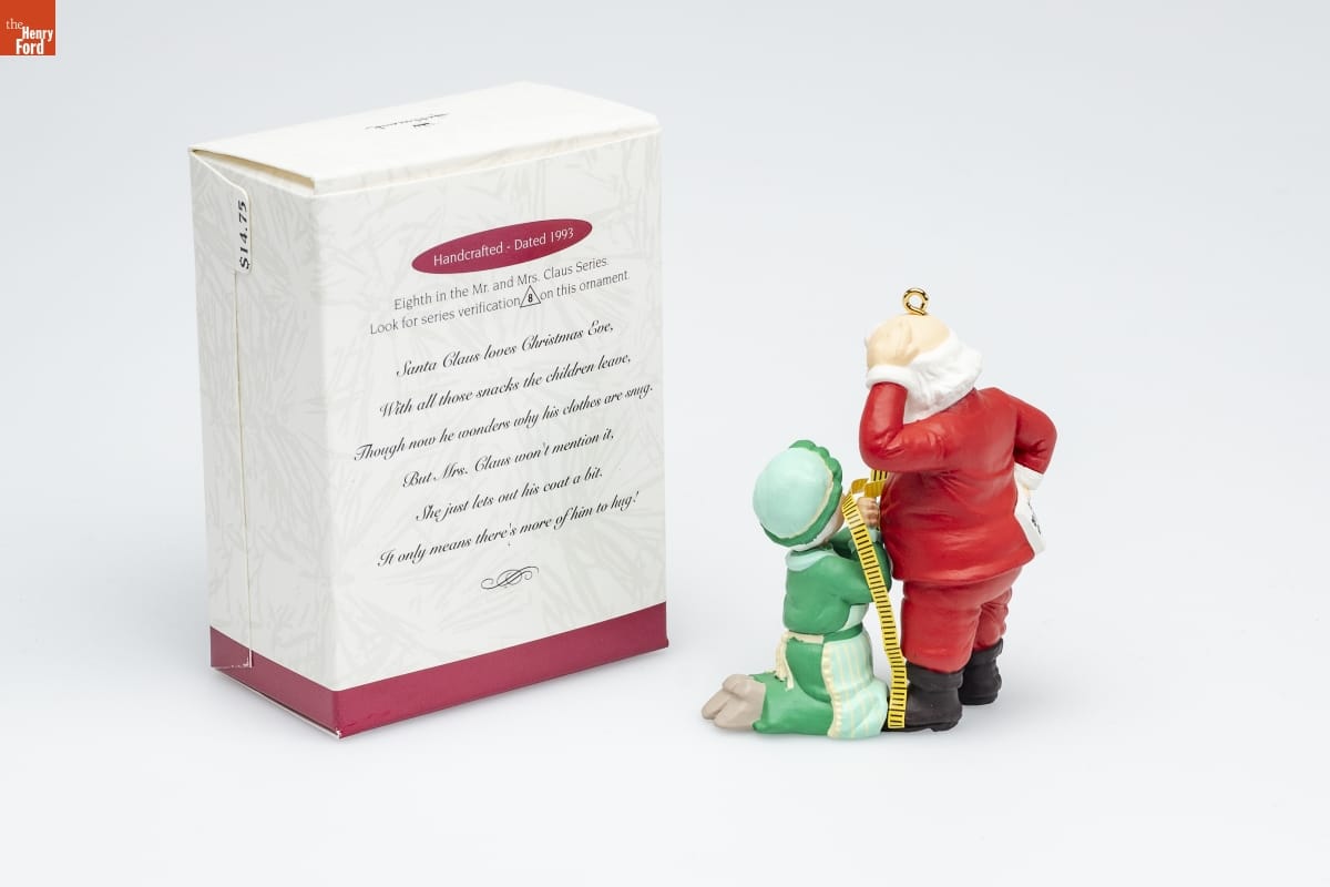 Handcrafted - Dated 1993 / Eighth in the Mr. and Mrs. Claus Series. / Look for series verification 8 on this ornament. / Santa Claus loves Christmas Eve, / With all those snacks the children leave, / Though now he wonders why his clothes are snug. / But Mrs. Claus won't mention it, / She just lets out his coat a bit. / It only means there's more of him to hug!