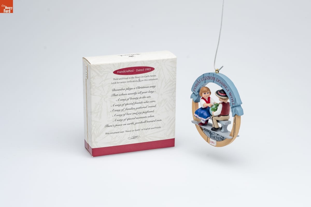 Handcrafted - Dated 1993 / Third and Final in the Peace on Earth Series. / Look for series verification 3 on this ornament. / December plays a Christmas song / That echoes sweetly all year long-- / A song of beauty in the air, / A song of special friends who care, / A song of families gathered 'round, / A song of love and joy profound, / A song of special moments when / There's peace on earth, goodwill toward men. / This ornament says "Peace on Earth" in English and Polish.