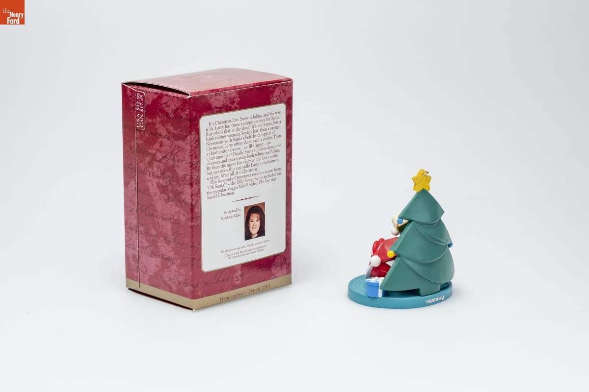 It's Christmas Eve. Snow is falling and the tree / is lit. Larry has three yummy cookies for Santa. / But who's that at the door? It's not Santa, but a / bank robber wearing Santa's hat, then a savage / Norseman with Santa's belt. In the spirit of / Christmas, Larry offers them each a cookie. Then / a third visitor arrives...an IRS agent...on / Christmas Eve? Finally Santa tumbles down the / chimney and chases away both robber and Viking. / By then the agent has claimed the last cookie, / but not even this can stifle Larry's excitement / and joy. After all, it's Christmas! / This Keepsake Ornament recalls a scene from / "Oh Santa!"--the Silly Song that is included on / the popular VeggieTales(R) video The Toy that / Saved Christmas. / Sculpted by Kristina Kline / For decorative use only. Not for young children. / Concue a des fins decoratives seulement. / Ne convient pas aux jeunes enfants. / Handcrafted - Dated 2001