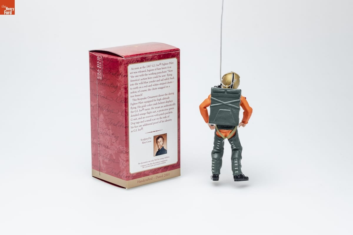 As soon as the 1967 G.I. Joe(R) Fighter Pilot / set was released, legions of fans knew it as / "the one with the working parachute." Now / America's action hero could be sent flying / into the wild blue yonder and sail safely back / to earth on a red-and white-striped chute-- / unless, of course, the chute snagged on a / tree branch! / This Keepsake Ornament shows the daring / Fighter Pilot equipped for high-altitude / flying. His gold-color crash helmet displays / the G.I. Joe(R) name. He wears an authentically / detailed orange flight suit. a protective green / G suit, and an overvest with patch pockets. / Dog tags and a small scar on the side of / his face are additional proof of his identity / as G.I. Joe(R). / Sculpted by / Ken Crow / For decorative use only. Not for young children. / Concue a des fins decoratives seulement. / Ne convient pas aux jeunes enfants. / Handcrafted - Dated 2001