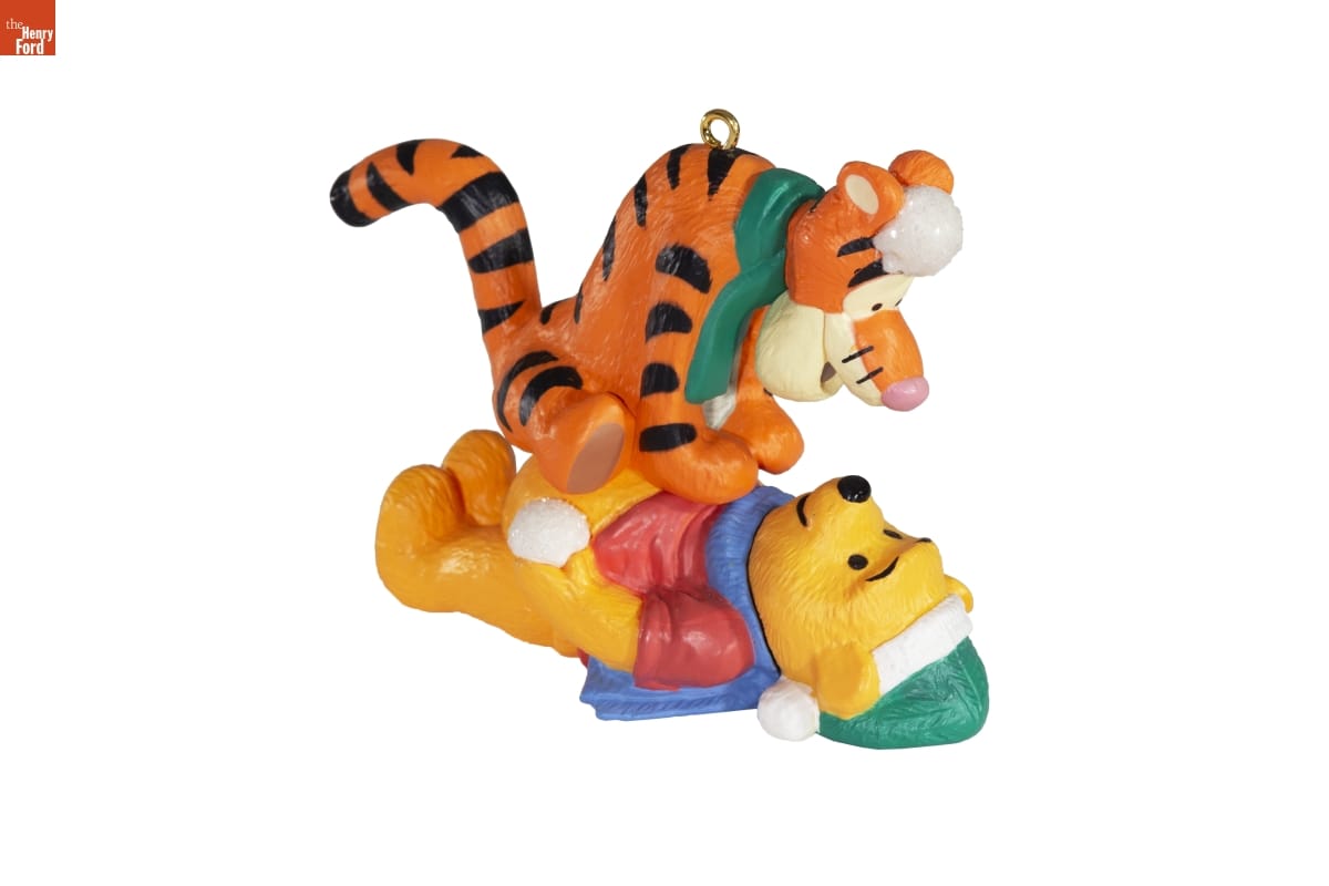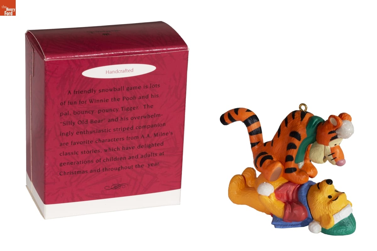 Handcrafted / A friendly snowball game is lots / of fun for Winnie the Pooh and his / pal, bouncy, pouncy Tigger. The / "Silly Old Bear" and his overwhelm- / ingly enthusiastic striped companion / are favorite characters from A.A. Milne's / classic stories, which have delighted / generations of children and adults at / Christmas and throughout the year.