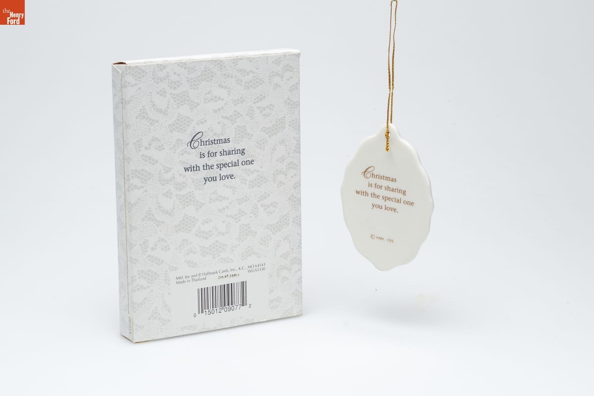 Christmas / is for sharing / with the special one / you love. / Mfd. for and (C) Hallmark Cards, Inc., K.C., MO 64141 / Made in Thailand WGA3330