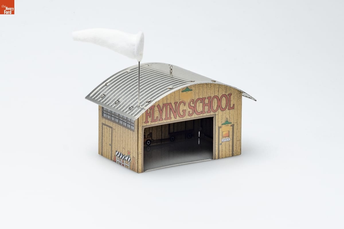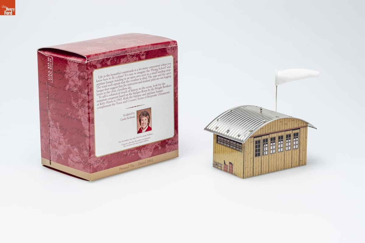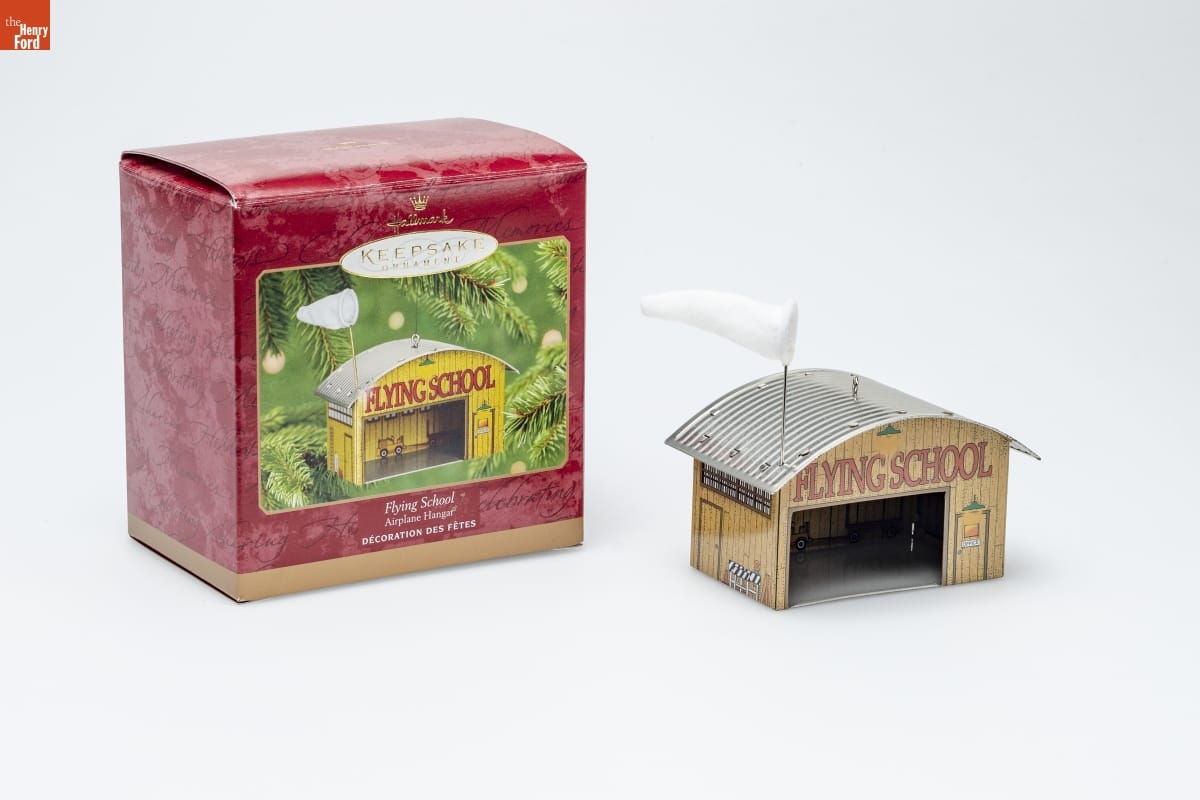 Life in the beautiful countryside is a lot more convenient when you / know how to fly a plane! It's easy to imagine the "Flying School" and / airplane hangar standing in an open area next to a small landing strip. / The wind sock signals that the weather is ideal. The sign and the open / hangar door suggest that the instructor and student pilot are out logging / hours in the clear, cloudless sky. / To add a whimsical touch of history to the scene, look for the / miniature ornament based on the biplane flown by the Wright Brothers / at Kitty Hawk in 1903. Both the biplane and airplane hangar / compliment the Town and Country Series of Keepsake Ornaments. / Sculpted by / Linda Sickman / For decorative use only. Not for young children. / Concue a des fins decoratives seulement. / Ne convient pas aux jeunes enfants. / Pressed Tin - Dated 2001