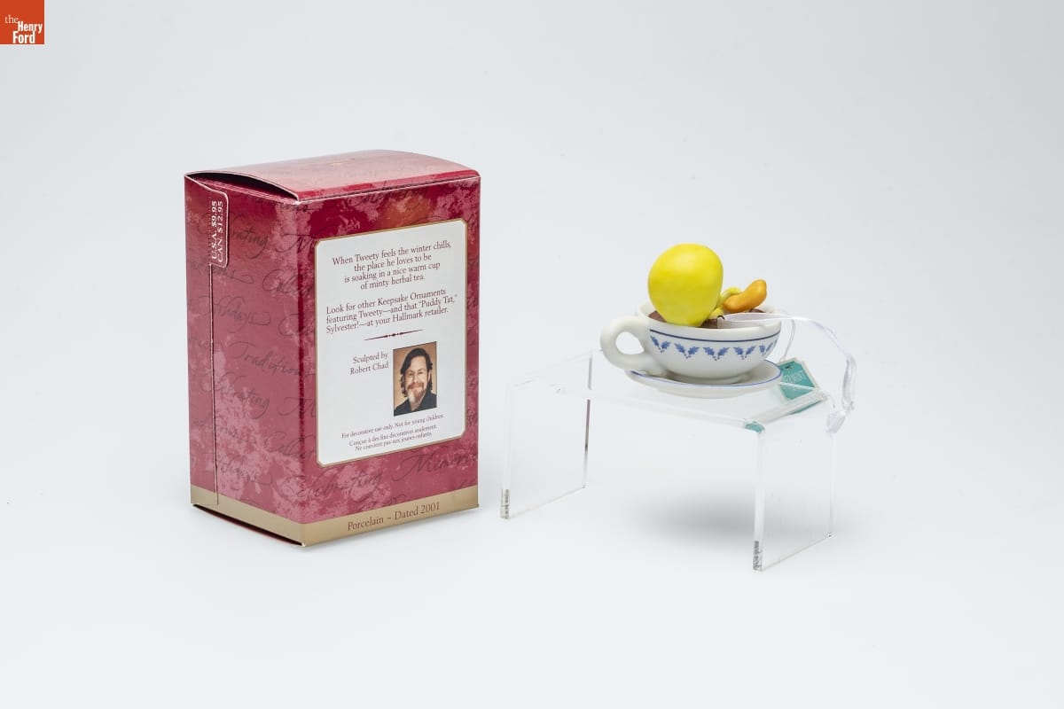 When Tweety feels the winter chills, / the place he loves to be / is soaking in a nice warm cup / of minty herbal tea. / Look for other Keepsake Ornaments / featuring Tweety--and that "Puddy Tat," / Sylvester!--at your Hallmark retailer. / Sculpted by / Robert Chad / For decorative use only. Not for young children. / Concue a des fins decoratives seulement. / Ne convient pas aux jeunes enfants. / Porcelain - Dated 2001