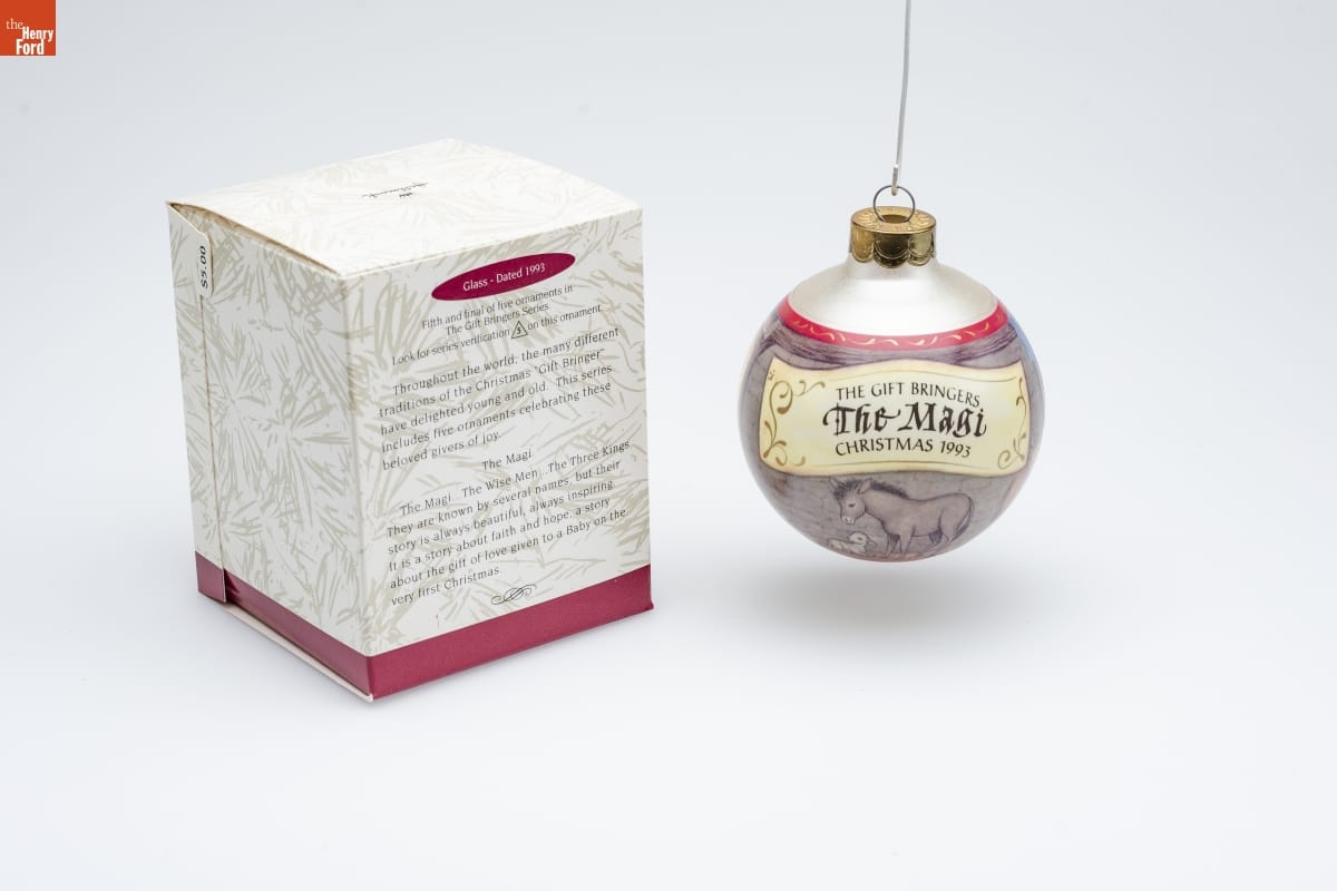 Glass - Dated 1993 / Fifth and final of five ornaments in / The Gift Bringers Series. / Look for series verification 5 on this ornament. / Throughout the world, the many different / traditions of the Christmas "Gift Bringer" / have delighted young and old. This series / includes five ornaments celebrating these / beloved givers of joy. / The Magi / The Magi... The Wise Men... The Three Kings. / They are known by several names, but their / story is always beautiful, always inspiring. / It is a story about faith and hope, a story / about the gift of love given to a Baby on the / very first Christmas.