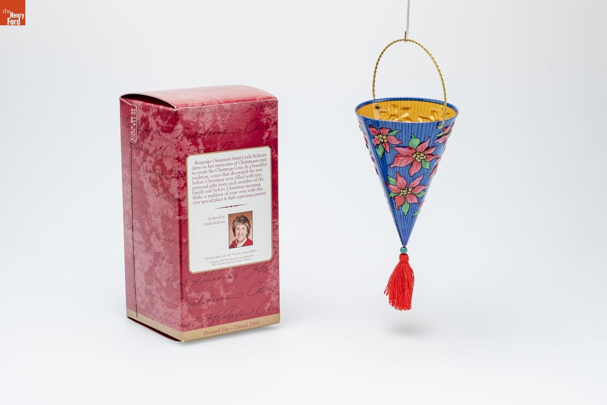 Keepsake Ornament Artist Linda Sickman / drew on her memories of Christamses past / to create the Christmas Cone. In a beautiful / tradition, cones that decorated the tree / before Christmas were filled with tiny, / personal gifts from each member of the / family just before Christmas morning. / Make a tradition of your own with this / very special place to hide a precious present. / Sculpted by / Linda Sickman / For decorative use only. Not for young children. / Concue a des fins decoratives seulement. / Ne convient pas aux jeunes enfants. / Pressed Tin - Dated 2001