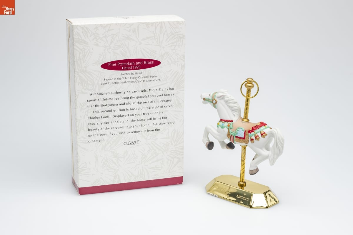 Fine Porcelain and Brass / Dated 1993 / Painted by Hand / Second in the Tobin Fraley Carousel Series. / Look for series verification 2 on this ornament. / A renowned authority on carousels, Tobin Fraley has / spent a lifetime restoring the graceful carousel horses / that thrilled young and old at the turn of the century. / This second edition is based on the style of carver / Charles Looff. Displayed on your tree or on its / specially designed stand, the horse will bring the / beauty of the carousel into your home. Pull downward / on the base if you wish to remove it from the / ornament.