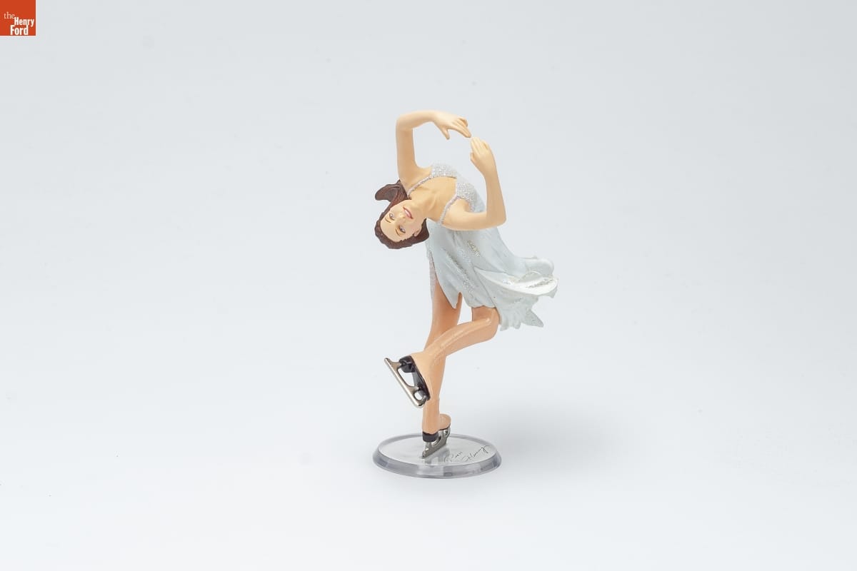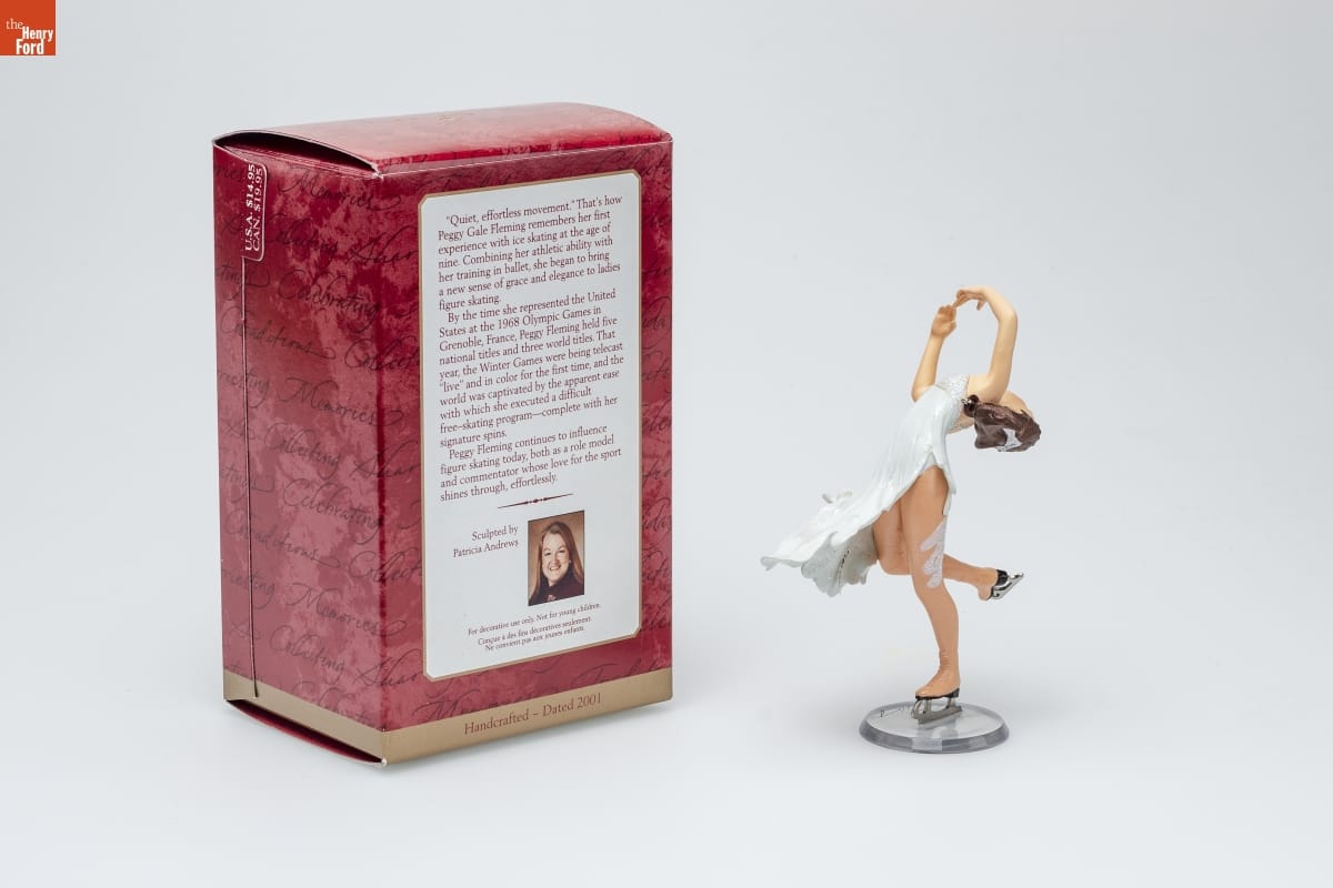 "Quiet, effortless movement." That's how / Peggy Gale Fleming remembers her first / experience with ice skating at the age of / nine. Combining her athletic ability with / her training in ballet, she began to bring / a new sense of grace and elegance to ladies / figure skating. / By the time she represented the United / States at the 1968 Olympic Games in / Grenoble, France, Peggy Fleming held five / national titles and three world titles. That / year, the Winter Games were being telecast / "live" and in color for the first time, and the / world was captivated by the apparent ease / with which she executed a difficult / free-skating program--complete with her / signature spins. / Peggy Fleming continues to influence / figure skating today, both as a role model / and commentator whose love for the sport / shines through, effortlessly. / Sculpted by / Patricia Andrews / For decorative use only. Not for young children. / Concue a des fins decoratives seulement. / Ne convient pas aux jeunes enfants. / Handcrafted - Dated 2001