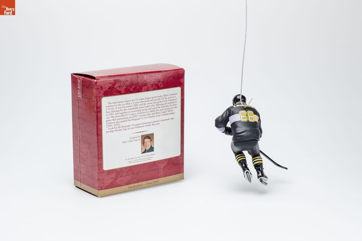 The only owner-player in U.S. major league sports today, Mario Lemieux / returned to the ice after a 3-year retirement and quickly led his team to a / 5-0 win. It was December 2000, and the arena was packed with Penguins'(R) / fans cheering for the remarkable team leader who, following his retirement / in 1997, put together an ownership group and saved the franchise for their / city. The powerful 6'4" center continues to exhibit the same passion for the / game that earned him six NHL(R) scoring titles and three League MVPs. / Lemieux also guided the Penguins(R) to two Stanley Cup(R) championships / (1991, 1992). / Look for the Keepsake Ornament featuring Lemieux's teammate and / protege Jaromir Jagr at your Hallmark retailer this year. / Sculpted by / John "Collin" Francis / For decorative use only. Not for young children. / Concue a des fins decoratives seulement. / Ne convient pas aux jeunes enfants. / Handcrafted - Dated 2001