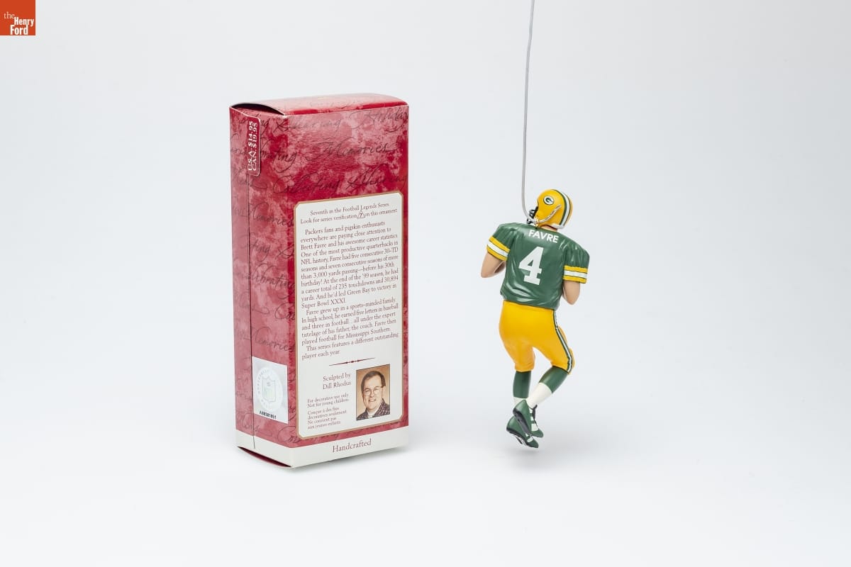 Seventh in the Football Legends Series. / Look for series verification 7 on this ornament. / Packers fans and pigskin enthusiasts / everywhere are paying close attention to / Brett Favre and his awesome career statistics. / One of the most productive quarterbacks in / NFL history, Favre had five consecutive 30-TD / seasons and seven consecutive seasons of more / than 3,000 yards passing--before his 30th / birthday! At the end of the '99 season, he had / a career total of 235 touchdowns and 30,894 / yards. And he'd led Green Bay to victory in / Super Bowl XXXI. / Favre grew up in a sports-minded family. / In high school, he earned five letters in baseball / and three in football...all under the expert / tutelage of his father, the coach. Favre then / played football for Mississippi Southern. / This series features a different outstanding / player each year. / Sculpted by / Dill Rhodus / For decorative use only./ Not for young children. / Concue a des fins / decoratives seulement. / Ne convient pas / aux jeunes enfants. / Handcrafted