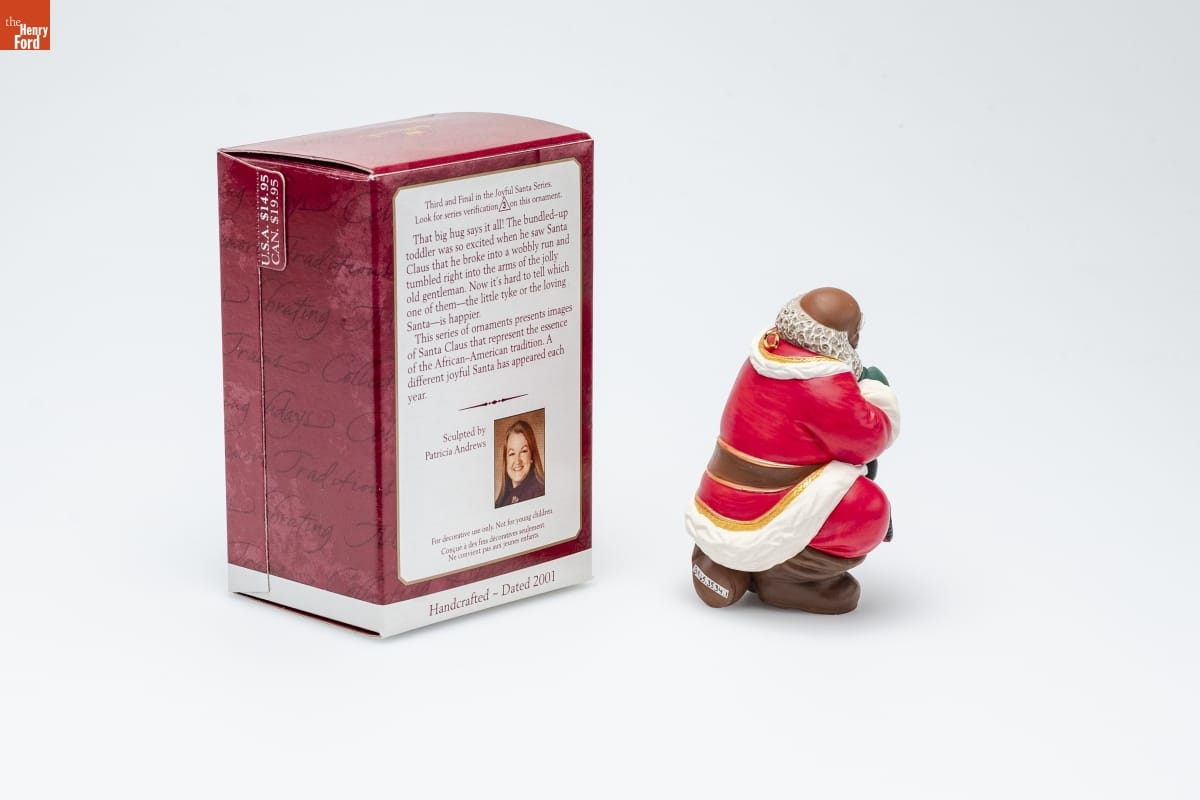 Third and Final in the Joyful Santa Series. / Look for series verification 3 on this ornament. / That big hug says it all! The bundled-up / toddler was so excited when he saw Santa / Claus that he broke into a wobbly run and / tumbled right into the arms of the jolly / old gentleman. Now it's hard to tell which / one of them--the little tyke or the loving / Santa--is happier. / This series of ornaments presents images / of Santa Claus that represent the essence / of the African-American tradition. A / different joyful Santa has appeared each / year. / Sculpted by / Patricia Andrews / For decorative use only. Not for young children. / Concue a des fins decoratives seulement. / Ne convient pas aux jeunes enfants. / Handcrafted - Dated 2001