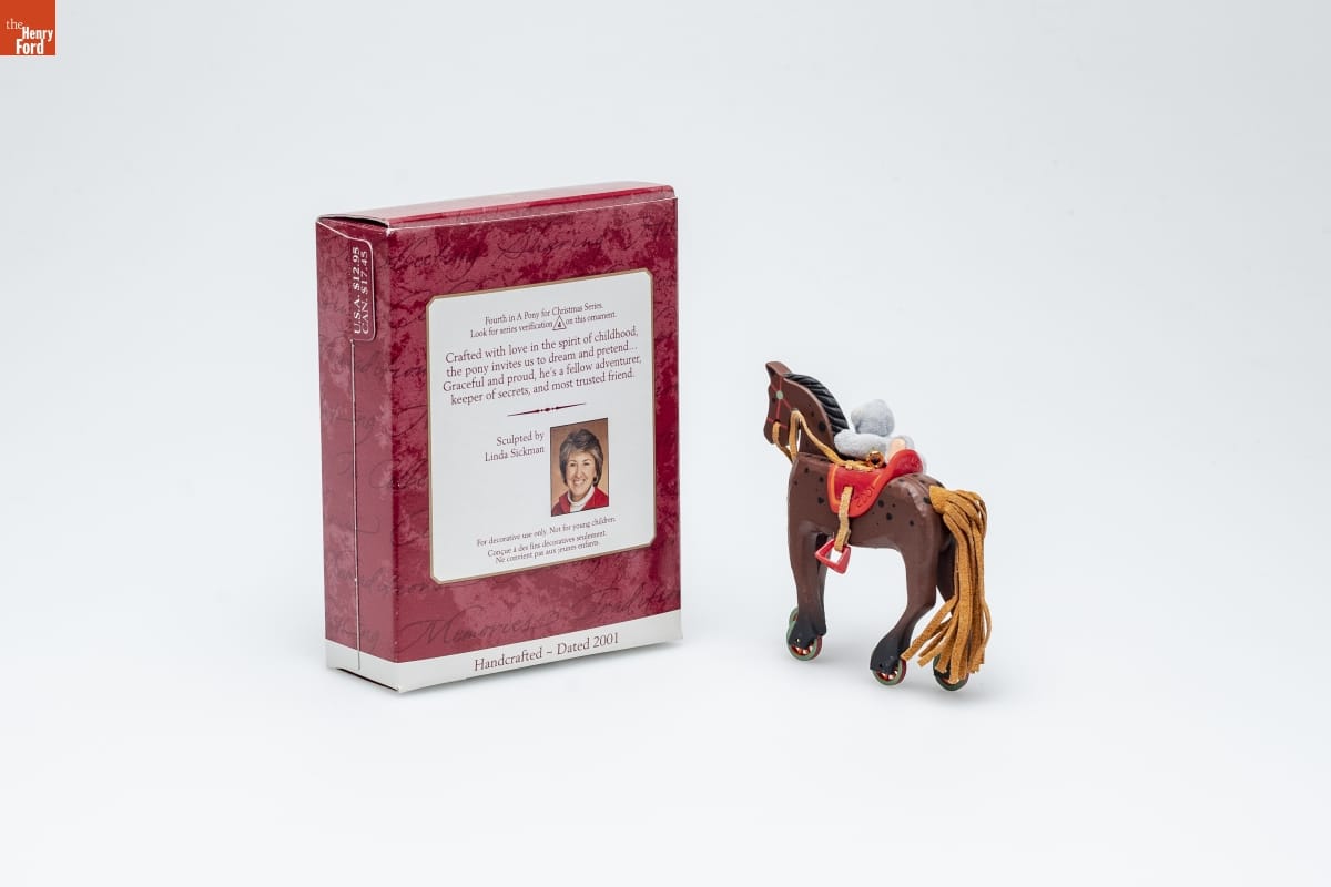 Fourth in the A Pony for Christmas Series. / Look for series verification 4 on this ornament. / Crafted with love in the spirit of childhood, / the pony invites us to dream and pretend... / Graceful and proud, he's a fellow adventurer, / keeper of secrets, and most trusted friend. / Sculpted by / Linda Sickman / For decorative use only. Not for young children. / Concue a des fins decoratives seulement. / Ne convient pas aux jeunes enfants. / Handcrafted - Dated 2001