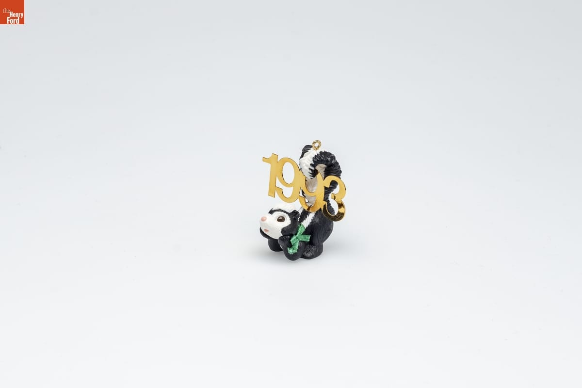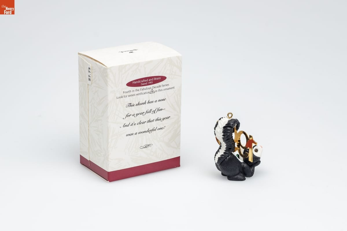 Handcrafted and Brass / Dated 1993 / Fourth in the Fabulous Decade Series. / Look for series verification 4 on this ornament. / This skunk has a nose / for a year full of fun-- / And it's clear that this year / was a wonderful one!