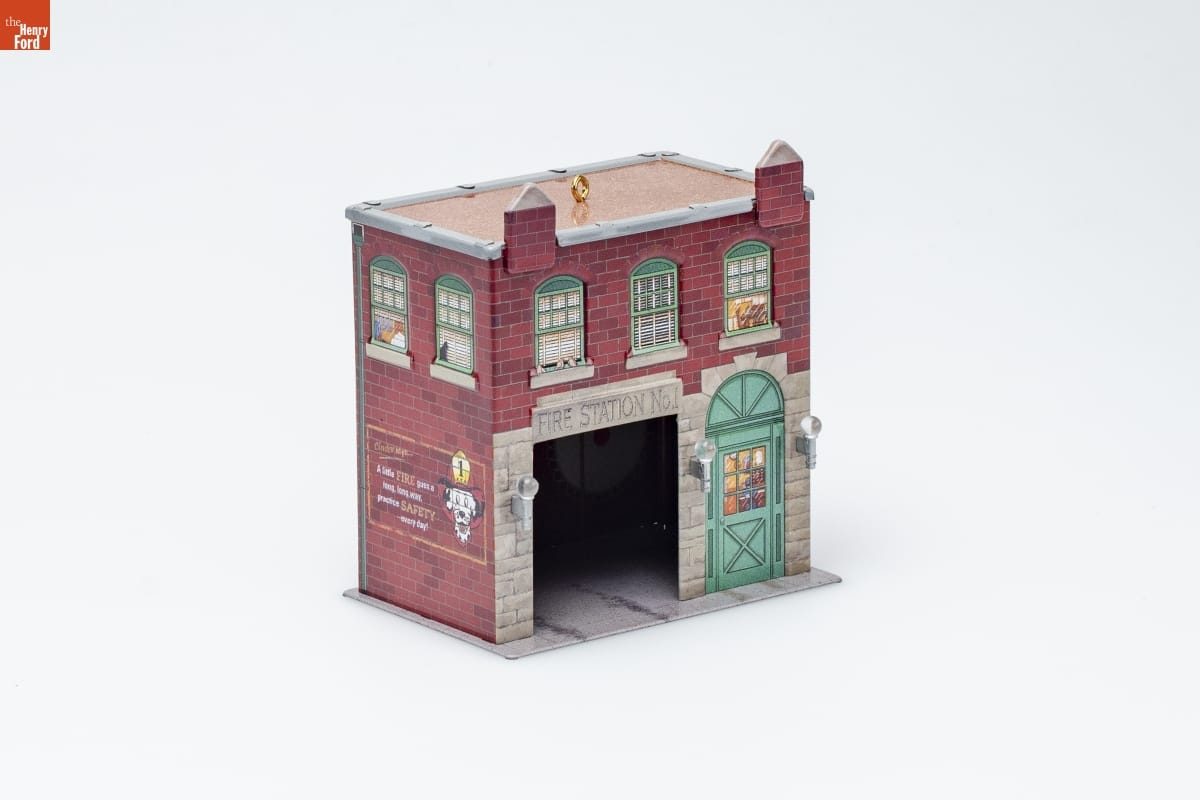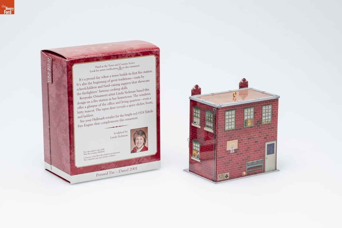 Third in the Town and Country Series. / Look for series verification 3 on this ornament. / It's a proud day when a town builds its first fire station. / It's also the beginning of great traditions--visits by / schoolchildren and fund-raising suppers that showcase / the firefighters' famous cooking skills. / Keepsake Ornament artist Linda Sickman based this / design on a fire station in her hometown. The windows / offer a glimpse of the office and living quarters--even a / kitty mascot. The open door reveals a spare slicker, boots, / and ladders. / See our Hallmark retailer for the bright red 1924 Toledo / Fire Engine that complements this ornament. / Sculpted by / Linda Sickman / For decorative use only. / Not for young children. / Concue a des fins decoratives seulement. / Ne convient pas aux jeunes enfants. / Pressed Tin - Dated 2001