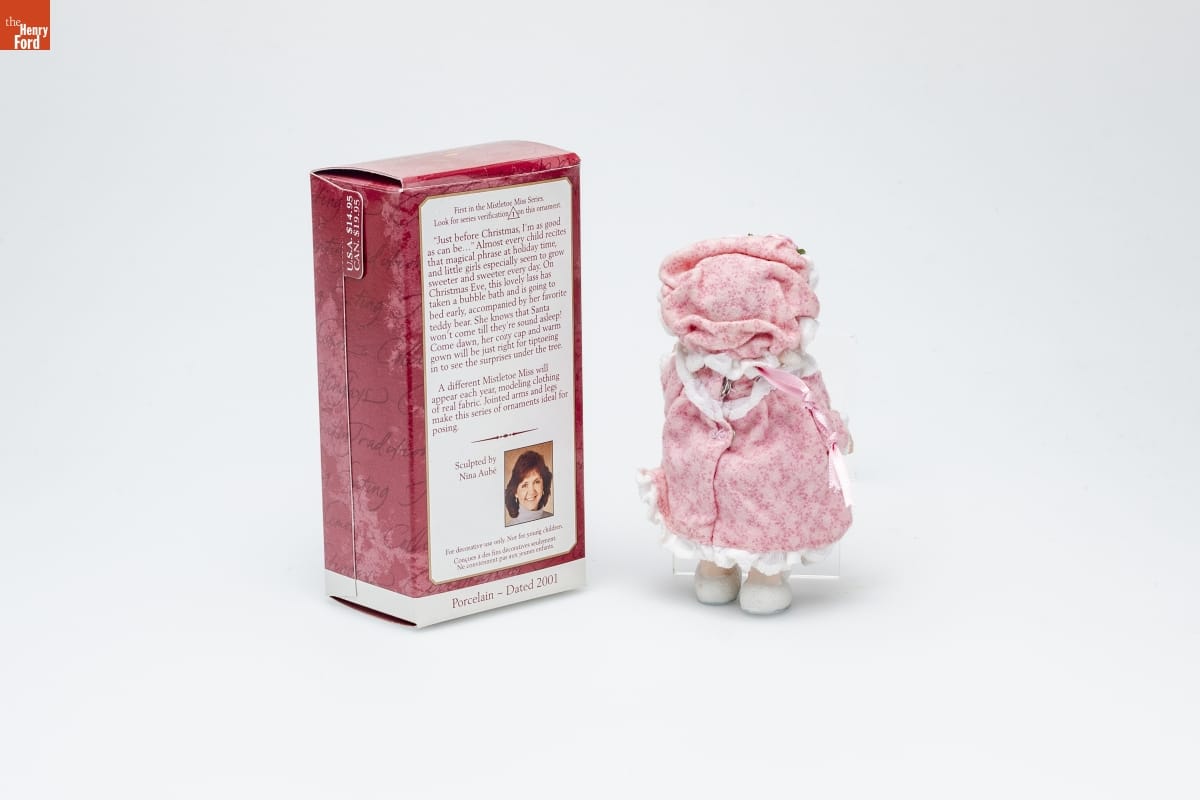 First in the Mistletoe Miss Series. / Look for series verification 1 on this ornament. / "Just before Christmas, I'm as good / as can be..." Almost every child recites / that magical phrase at holiday time, / and little girls especially seem to grow / sweeter and sweeter every day. On / Christmas Eve, this lovely lass has / taken a bubble bath and is going to / bed early, accompanied by her favorite / teddy bear. She knows that Santa / won't come till they're sound asleep! / Come dawn, her cozy cap and warm / gown will be just right for tiptoeing / in to see the surprises under the tree. / A different Mistletoe Miss will / appear each year, modeling clothing / of real fabric. Jointed arms and legs / make this series of ornaments ideal for / posing. / Sculpted by / Nina Aube / For decorative use only. Not for young children. / Concue a des fins decoratives seulement. / Ne convient pas aux jeunes enfants. / Porcelain - Dated 2001