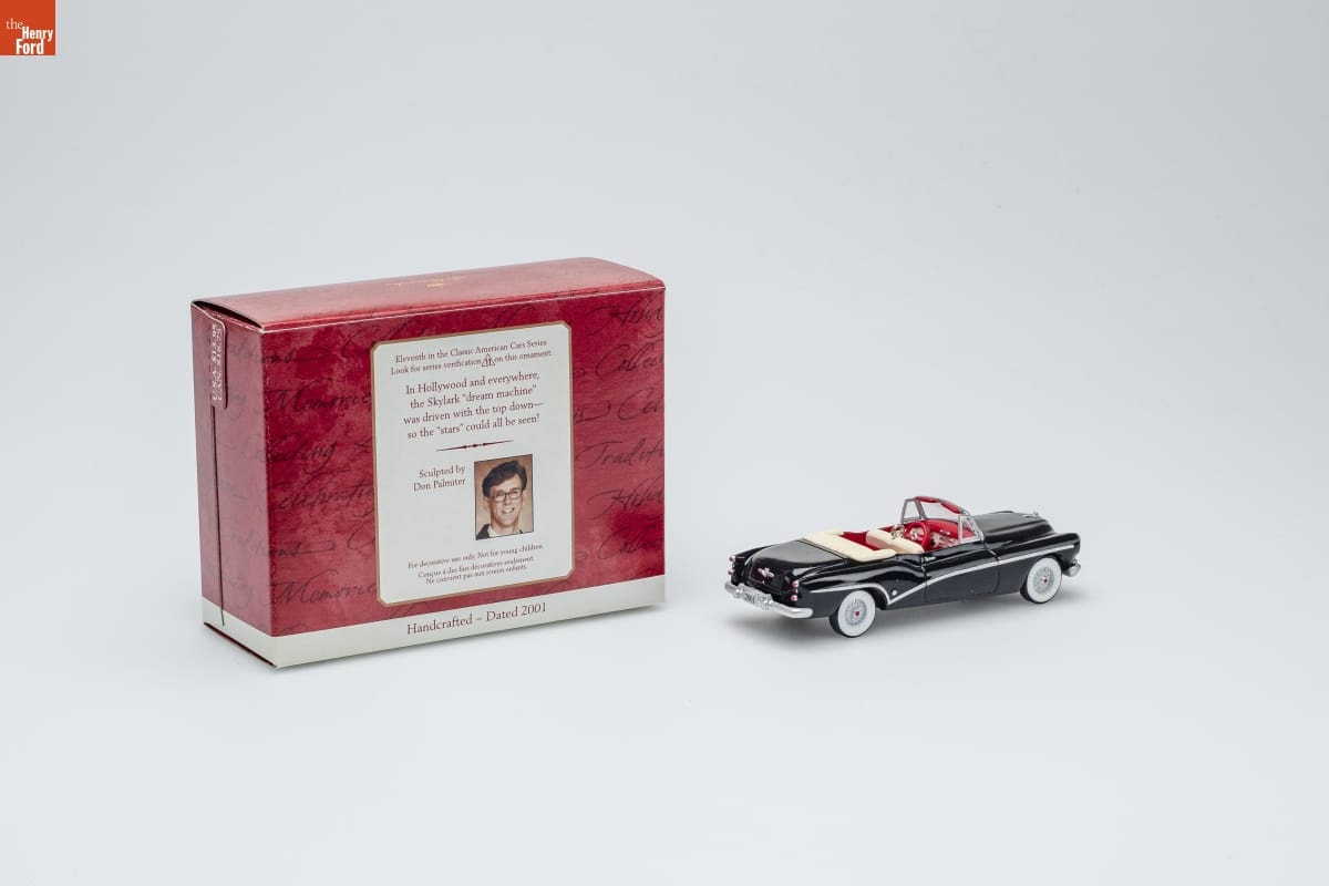 Eleventh in the Classic American Cars Series. / Look for series verification 11 on this ornament. / In Hollywood and everywhere, / the Skylark "dream machine" / was driven with the top down-- / so the "stars" could all be seen! / Sculpted by / Don Palmiter / For decorative use only. Not for young children. / Concue a des fins decoratives seulement. / Ne convient pas aux jeunes enfants. / Handcrafted - Dated 2001