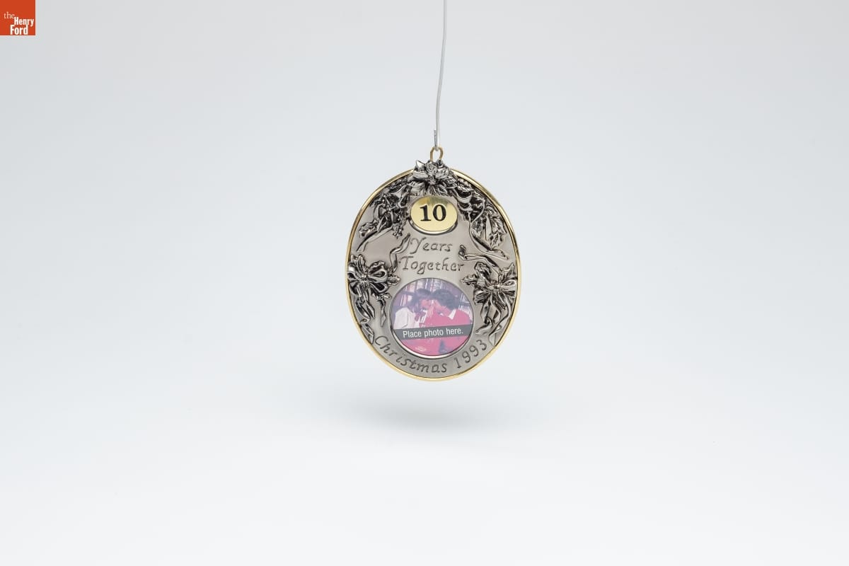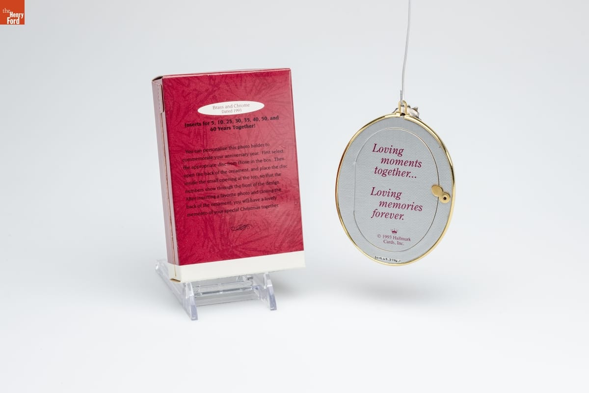Brass and Chrome / Dated 1993 / Inserts for 5, 10, 25, 30, 35, 40, 50, and / 60 Years Together! / You can personalize this photo holder to / commemorate your anniversary year. First select / the appropriate disc from those in the box. Then / open the back of the ornament, and place the disc / inside the small opening at the top, so that the / numbers show through the front of the design. / After inserting a favorite photo and closing the / back of the ornament, you will have a lovely / memento of your special Christmas together.