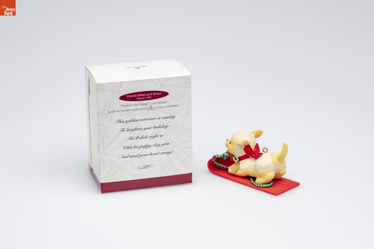 Handcrafted and Brass / Dated 1993 / Third in the Puppy Love Series. / Look for series verification 3 on this ornament. / This golden retriever is coming / To brighten your holiday-- / He'll slide right in / with his puppy-dog grin / And steal your heart away!