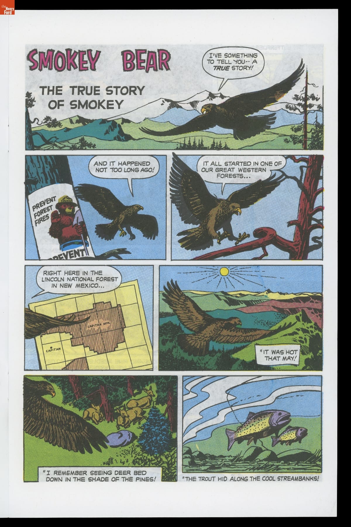 In 1950, firefighters saved a badly burned bear cub from a forest fire in the Capitan Mountains of New Mexico. His rescuers named him "Smokey Bear" after the fictional bear created in 1944 by the United States Forest Service to encourage forest fire prevention. The small cub became famous, joining his fictional cousin in the cause; he even became the subject of this comic book.