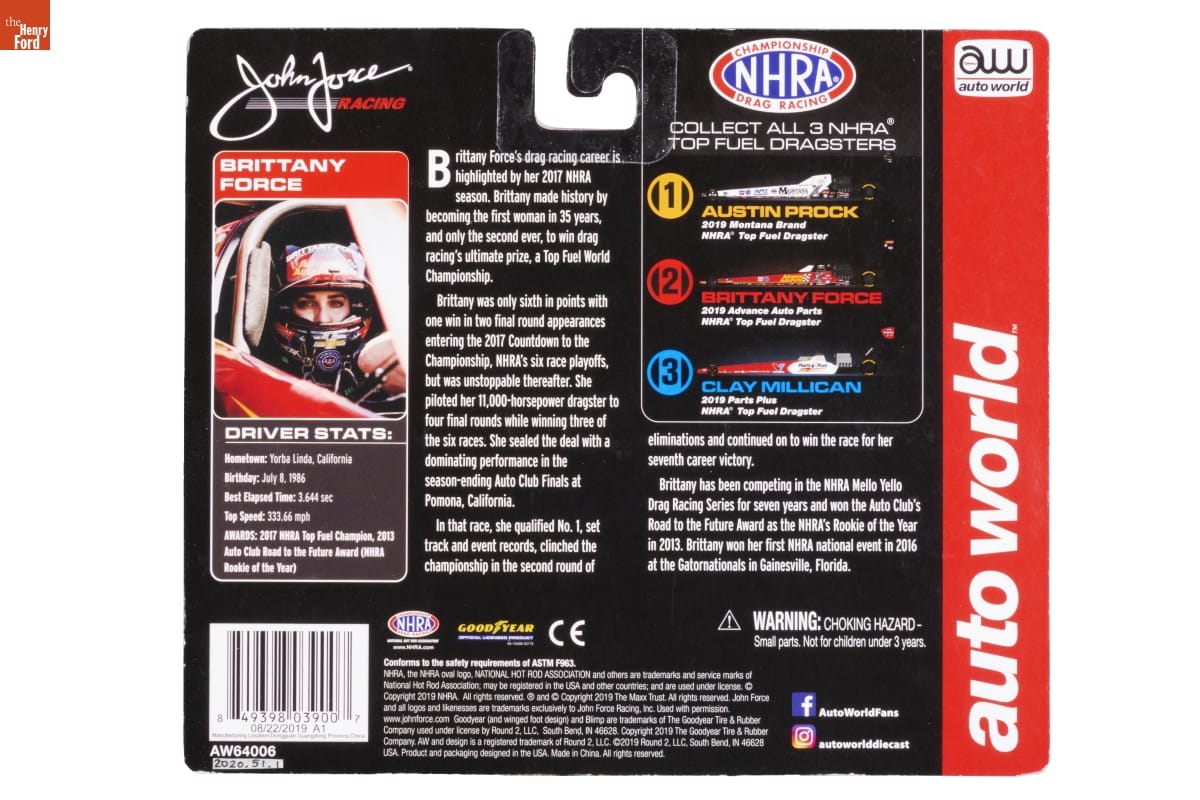 John Force / RACING / CHAMPIONSHIP / NHRA / DRAG RACING / COLLECT ALL 3 NHRA / TOP FUEL DRAGSTERS / 1 AUSTIN BROCK / 2019 Montana Brand / NHRA Top Fuel Dragster / 2 BRITTANY FORCE / 2019 Advance Auto Parts / NHRA Top Fuel Dragster / 3 CLAY MILLICAN / 2019 Parts Plus / NHRA Top Fuel Dragster / BRITTANY FORCE / DRIVER STATS: / Hometown: Yorba Linda, California / Birthday: July 8, 1986 / Best Elapsed Time: 3.644 sec / Top Speed: 333.66 mph / AWARDS: 2017 NHRA Top Fuel Champion, 2013 / Auto Club Road to the Future Award (NHRA / Rookie of the Year) / Brittany Force's drag racing career is / highlighted by her 2017 NHRA / season. Brittany made history by / becoming the first woman in 35 years, / and only the second ever, to win drag / racing's ultimate prize, a Top Fule World / Championship. / Brittany was only sixth in points with / one win in two final round appearances / entering the 2017 Countdown to the / Championship, NHRA's six race playoffs, / but was unstoppable thereafter. She / piloted her 11,000-horsepower dragster to / four final rounds while winning three of / the six races. She sealed the deal with a / dominating performance in the / season-ending Auto Club Finals at / Pomona, California. / In that race, she qualified No. 1, set / track and event records, clinched the / championship in the second round of / eliminations and continued on to win the race for her / seventh career victory. / Brittany has been competing in the NHRA Mello Yello / Drag Racing Series for seven years and won the Auto Club's / Road to the Future Award as the NHRA's Rookie of the YEar / in 2013. Brittany won her first NHRA national event in 2016 / at the Gatornationals in Gainsville, Florida. / CHAMPIONSHIP / NHRA / DRAG RACING / National Hot Rod Association / www.NHRA.com / GOOD YEAR / OFFICIAL LICENSED PRODUCT / WARNING: CHOKING HAZARD - / Small parts. Not for children under 3 years. / Conforms to the safety requirements of ASTM F963. / [...] / 08/22/2019 A1 / Manufacturing Location: Dongguan Guangdon Province, China / AW64006