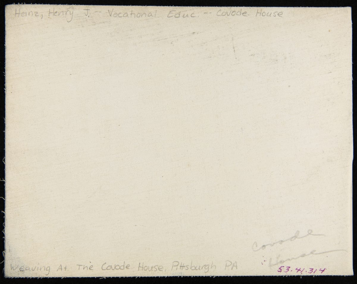 The H.J. Heinz Company was at the forefront of employee welfare during the late 19th and early 20th centuries. Amenities such as a gymnasium, swimming pool, and large dining rooms supported a strong company culture. Employees and their families were also encouraged to participate in self-improvement classes. Here, boys are seen weaving in the Covode House, a boys' club in the H.J. Heinz main plant.