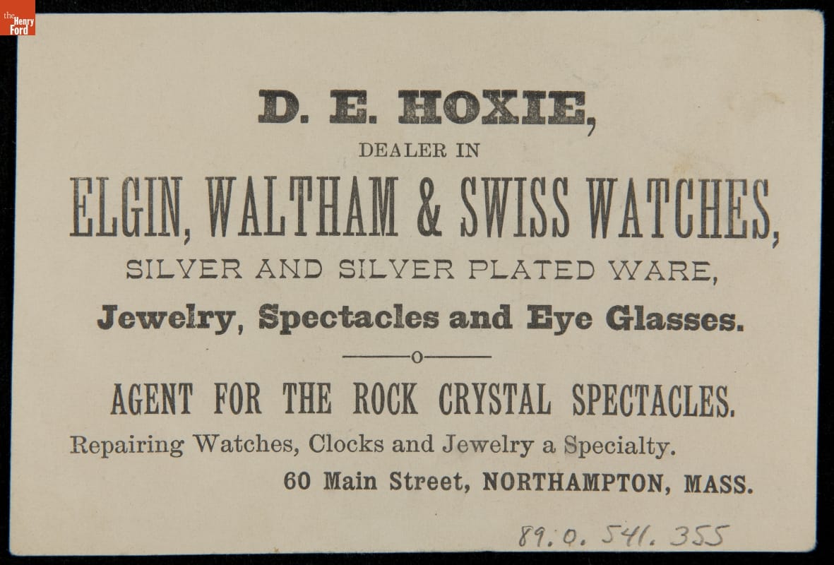 Trade Card for Merchant's Gargling Oil and Watchmaker D.E. Hoxie, 1870-1900
