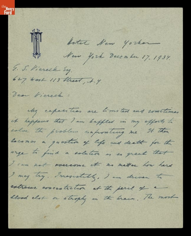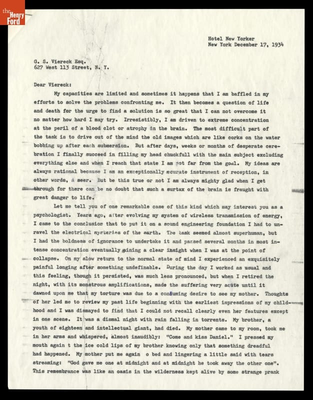 Letter from Nikola Tesla to George Sylvester Viereck, December 17, 1934