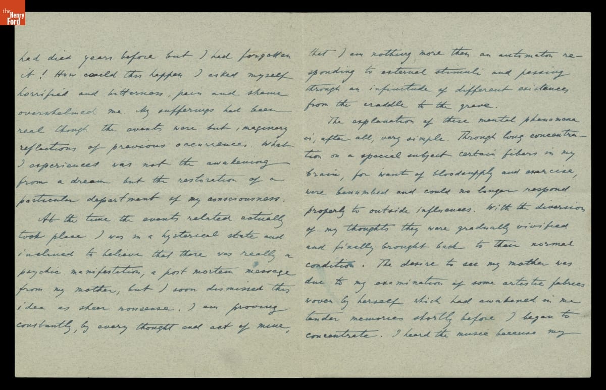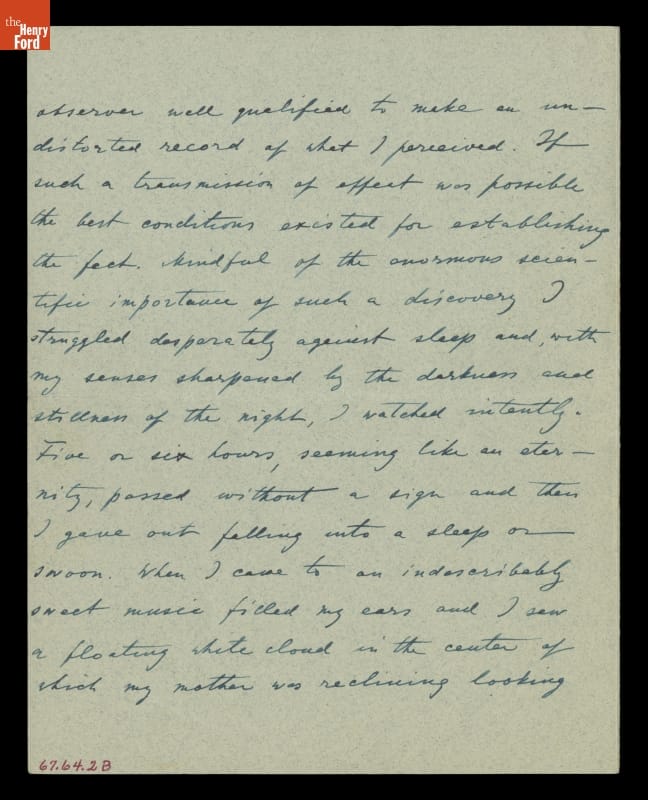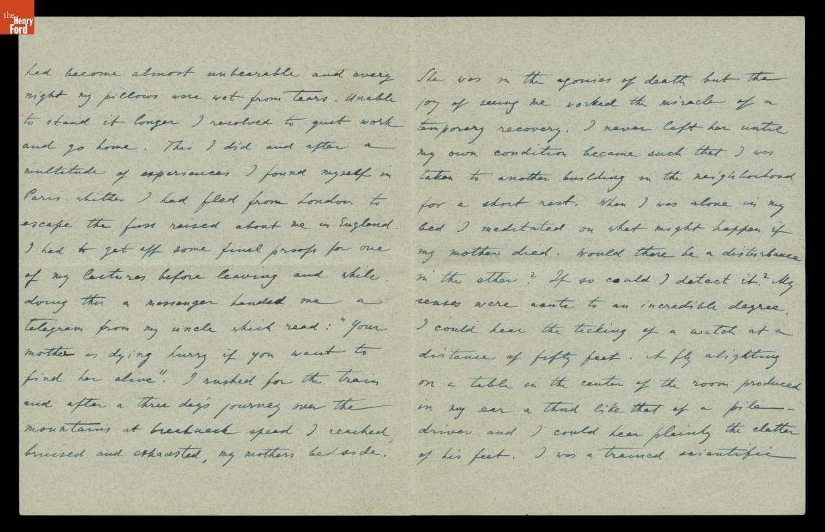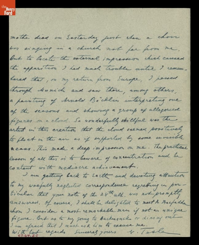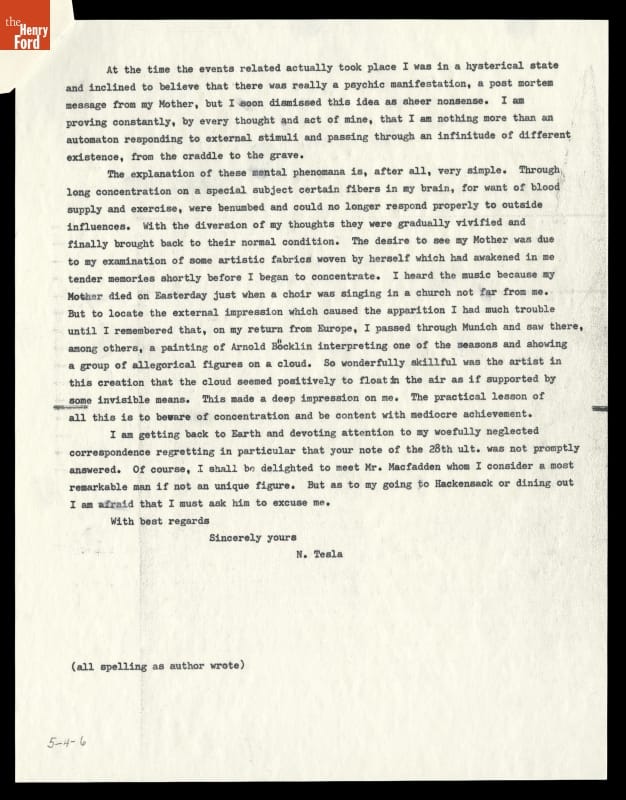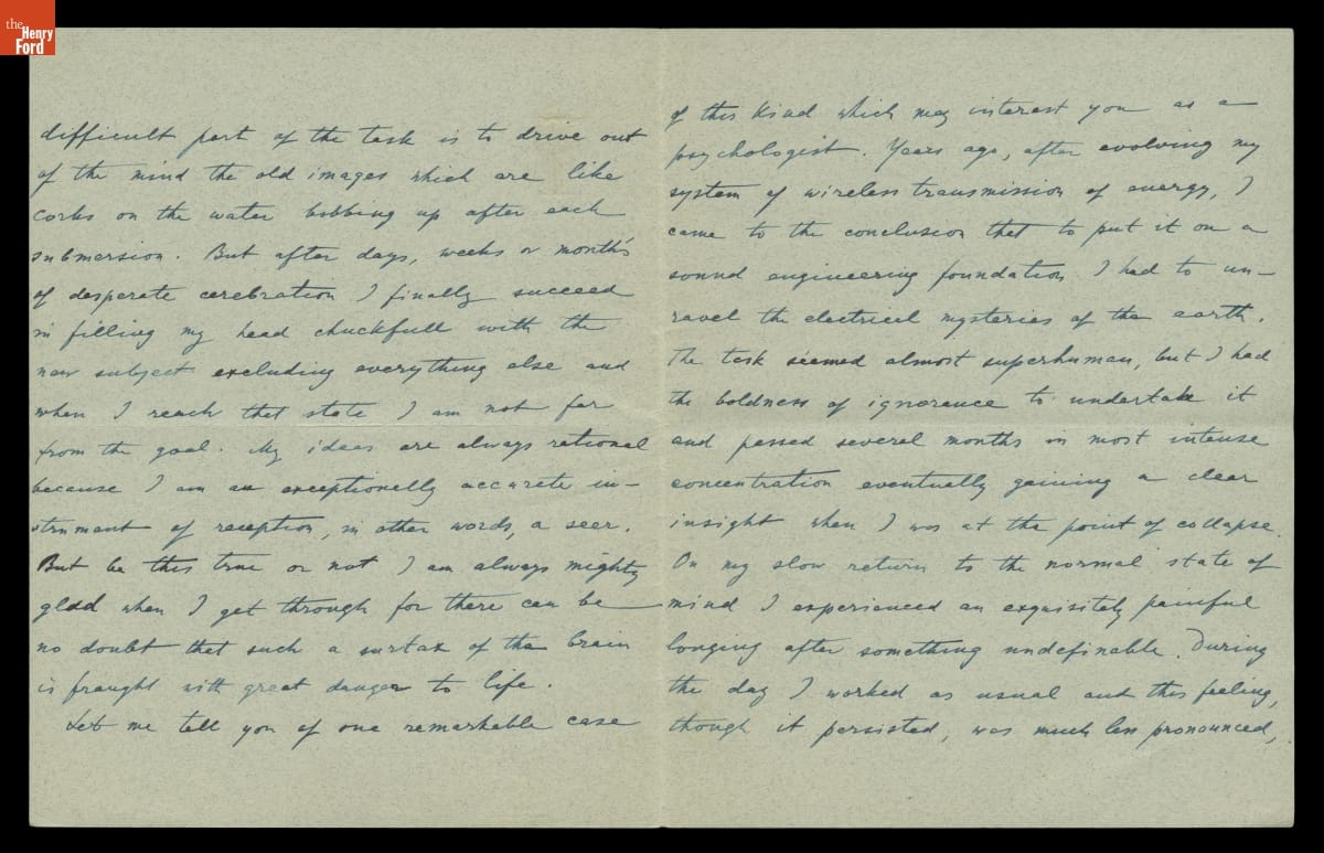 Nikola Tesla (1856-1943) is one of the greatest figures in the history of electrical power and telecommunications. In the early 1900s, the overworked inventor suffered a breakdown due to severe mental stress while trying to develop a method of wireless transmission of electric power. Tesla recounts his state of mind during this period in a 1934 letter to his friend, George Viereck.