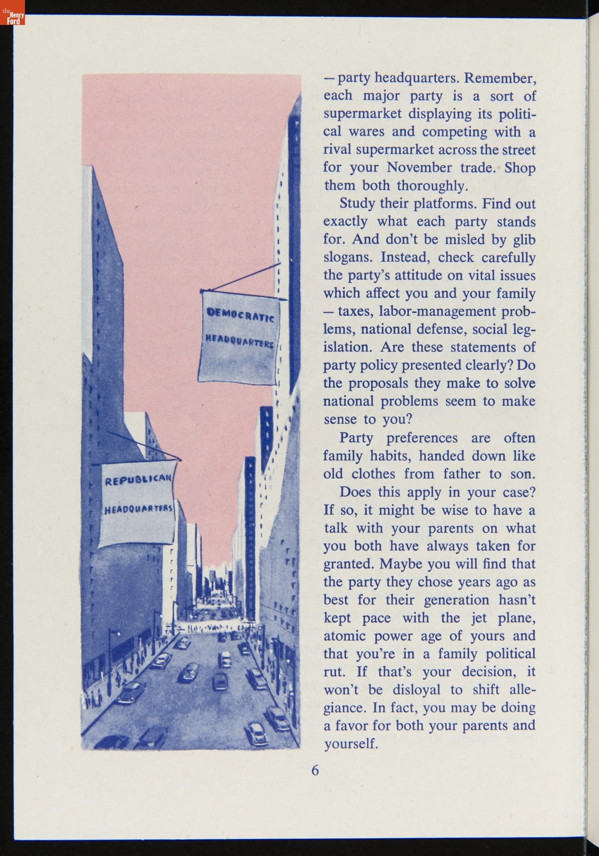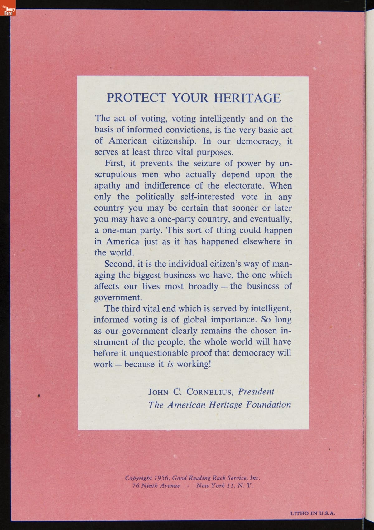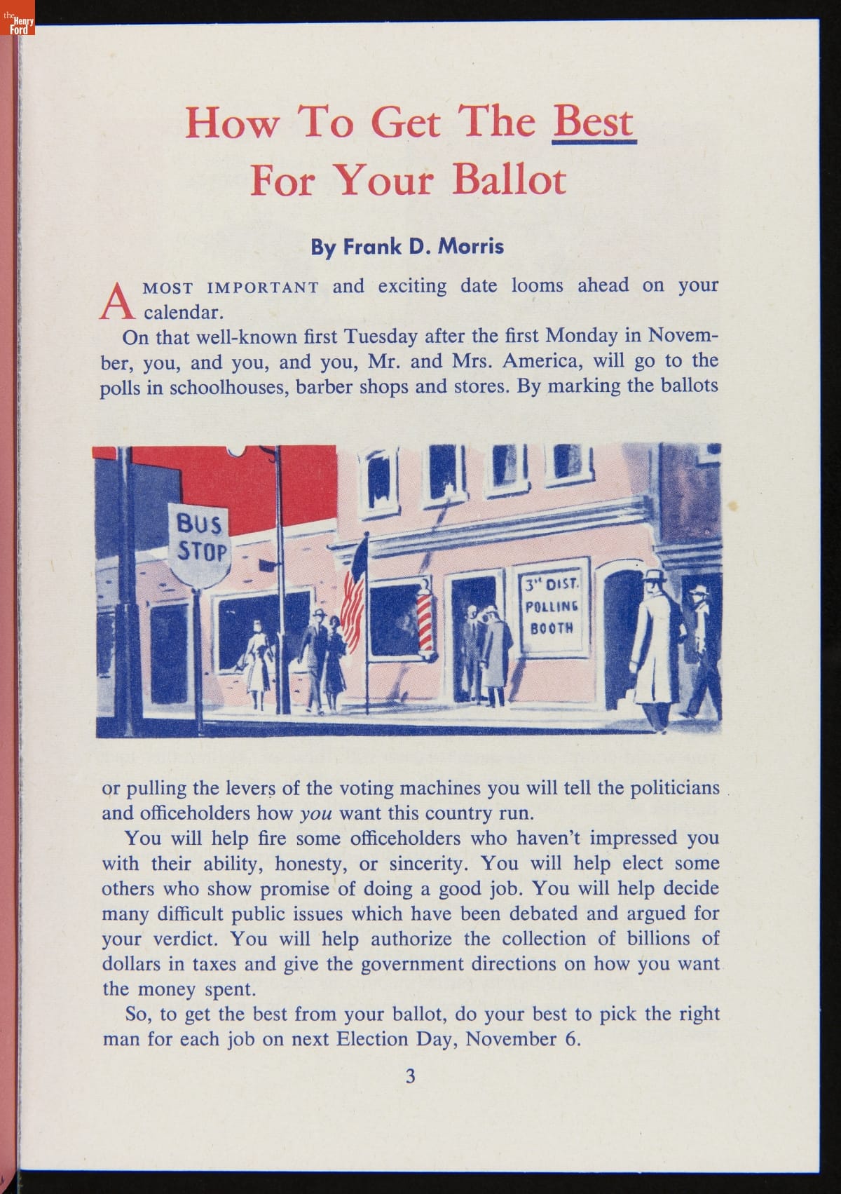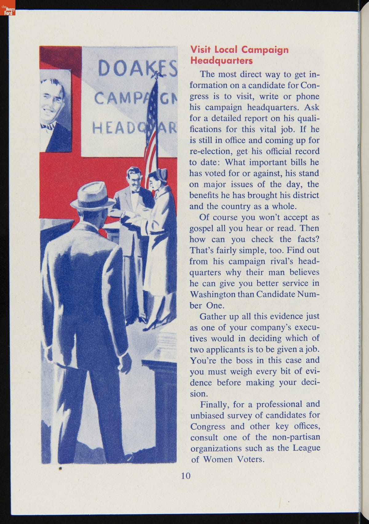 The success of the democratic process depends on voter participation. Organizations of all kinds have work to inform voters and stimulate turnout on election day. This booklet included key information to prepare voters and encourage participation in the 1956 presidential election.