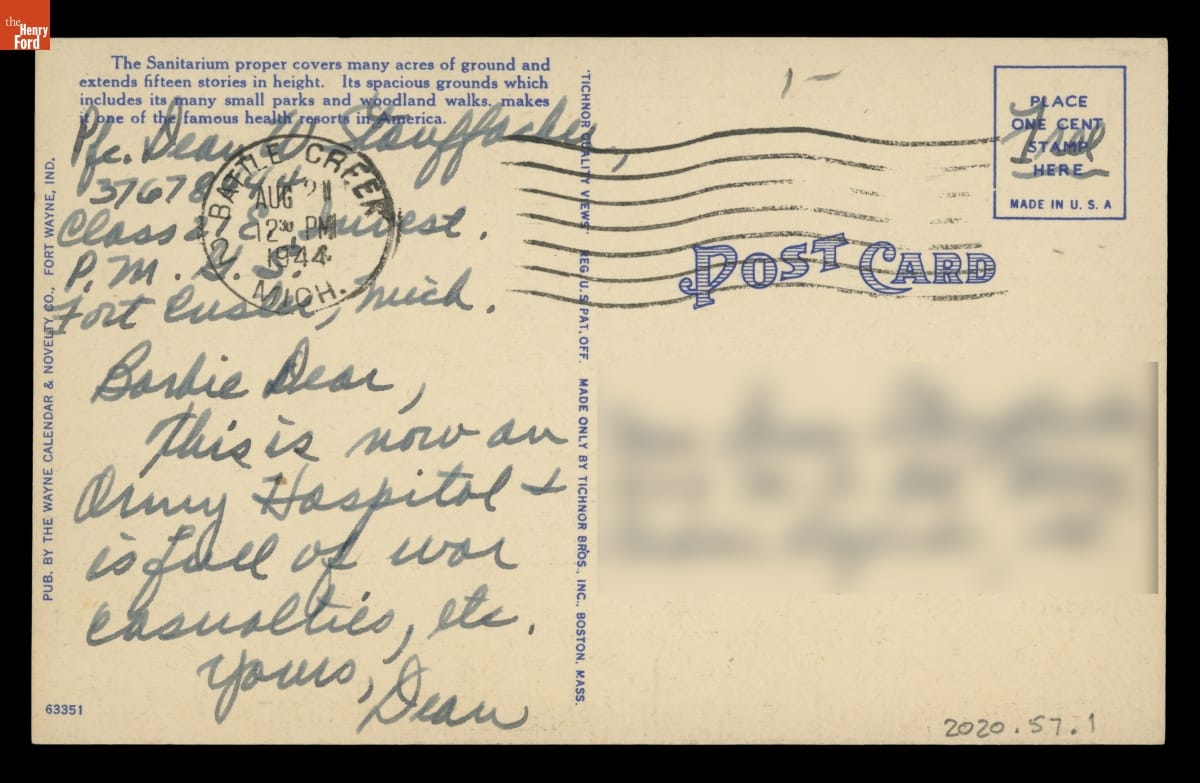 Percy Jones General Hospital Postcard, Sent Home from Fort Custer Military Training Base, August 12, 1944