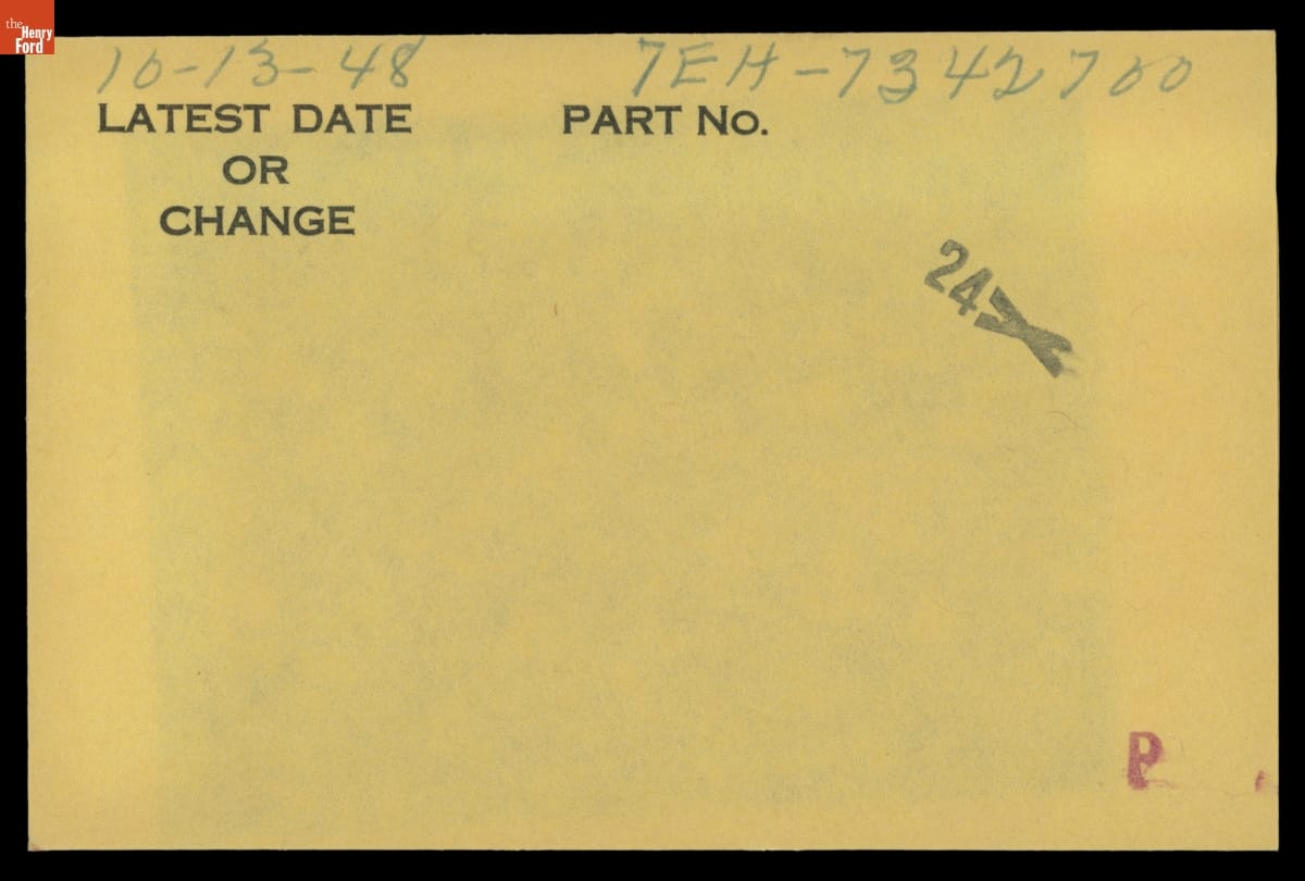 The Ford Motor Company created over a million parts drawings from 1903 to 1957. Many of these drawings specify engineering requirements for the components of Ford-made vehicles--including automobiles, trucks, tractors, military vehicles and Tri-motor airplanes. Others document assembly components, stages of casting and forging, or experimental designs. Beginning in the 1940s, Ford transferred the drawings to microfilm.