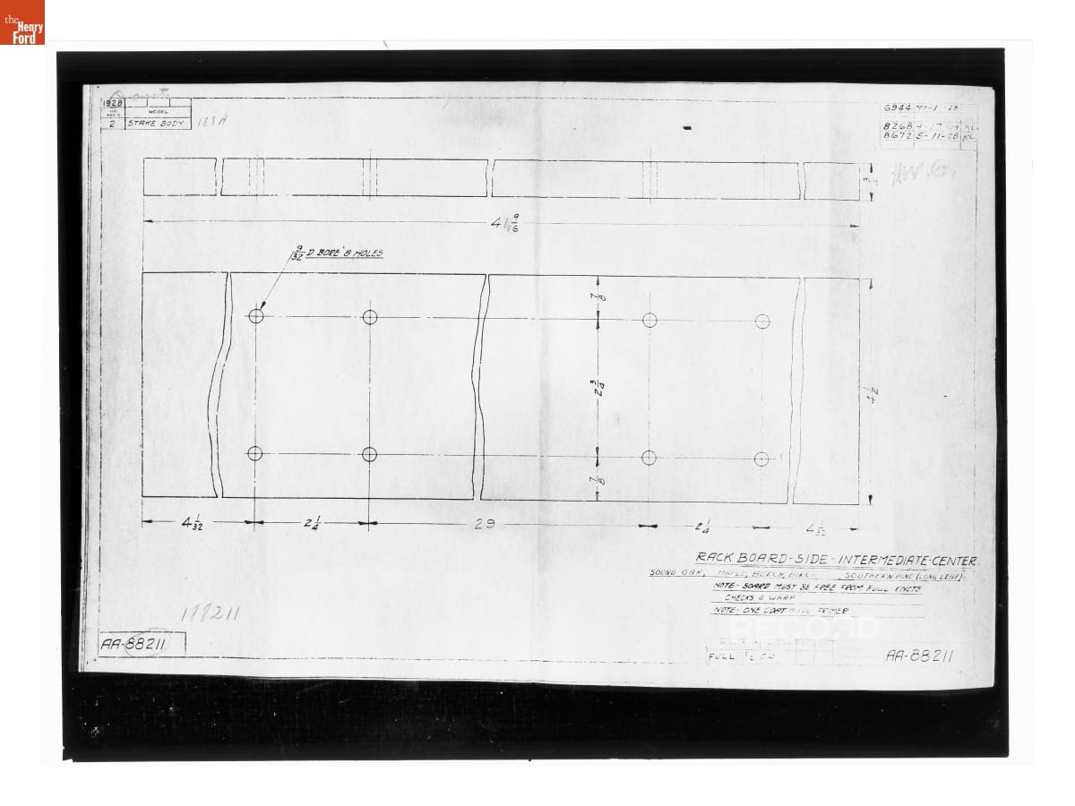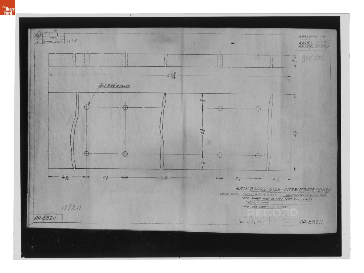 The Ford Motor Company created over a million parts drawings from 1903 to 1957. Many of these drawings specify engineering requirements for the components of Ford-made vehicles--including automobiles, trucks, tractors, military vehicles and Tri-motor airplanes. Others document assembly components, stages of casting and forging, or experimental designs. Beginning in the 1940s, Ford transferred the drawings to microfilm.