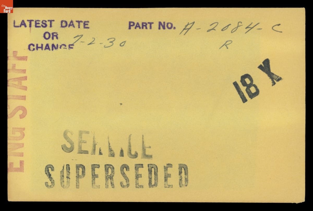 The Ford Motor Company created over a million parts drawings from 1903 to 1957. Many of these drawings specify engineering requirements for the components of Ford-made vehicles--including automobiles, trucks, tractors, military vehicles and Tri-motor airplanes. Others document assembly components, stages of casting and forging, or experimental designs. Beginning in the 1940s, Ford transferred the drawings to microfilm.