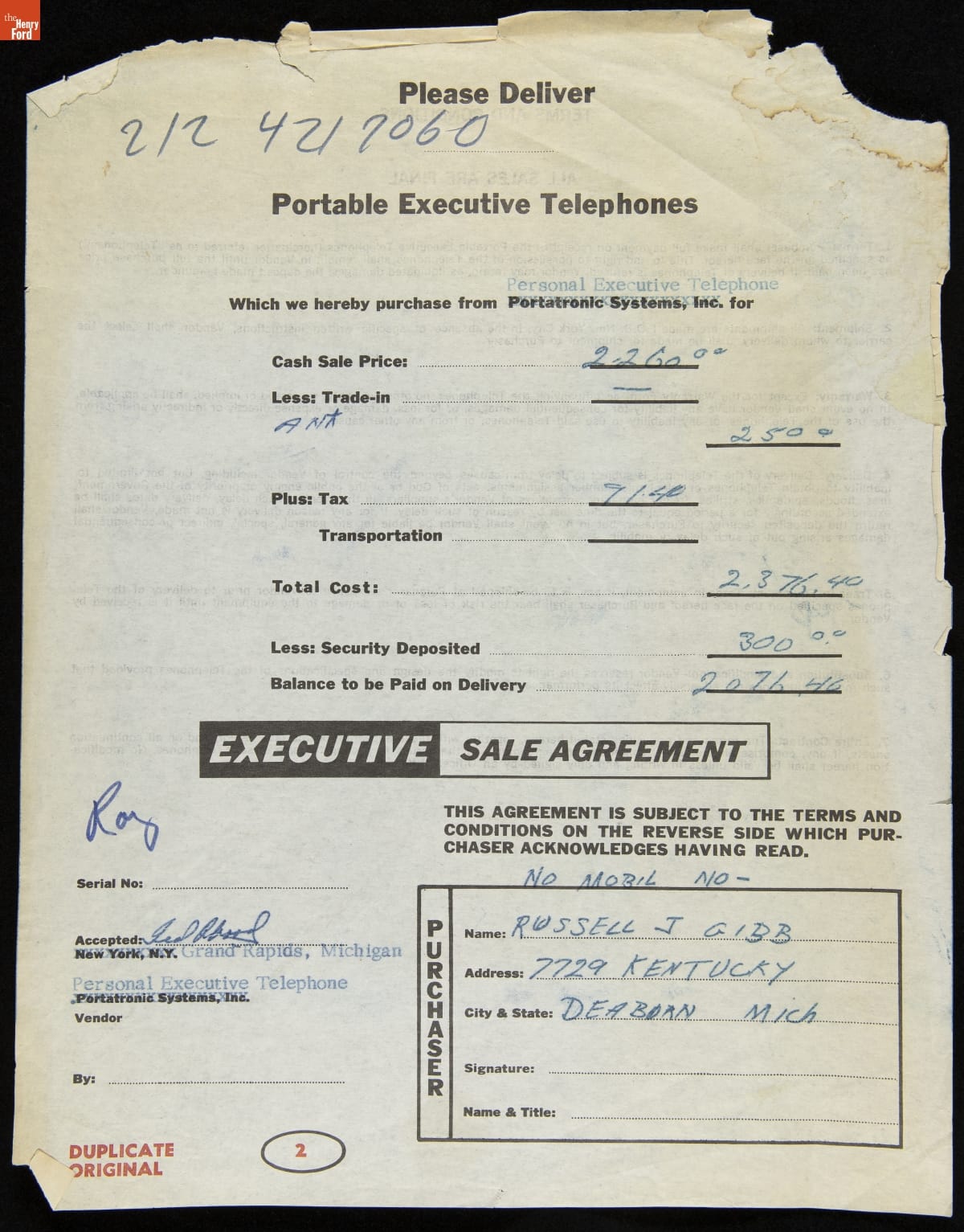 Receipt for the Purchase of a Portable Executive Telephone by Russ Gibb, circa 1968