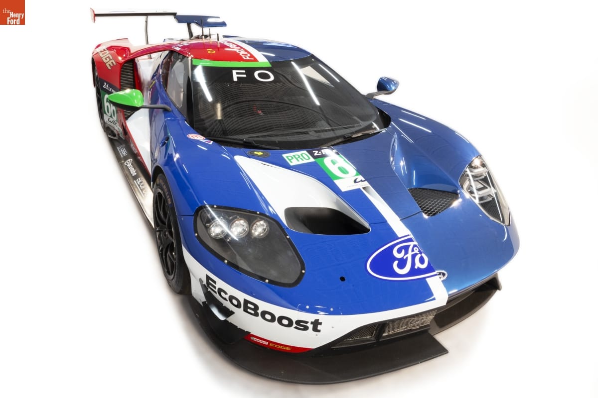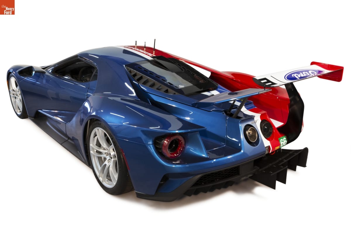 Ford and Multimatic built the GT in racing and production versions. This cutaway is half race car, half road car. The race car has a large fixed spoiler and additional cooling ducts, while the road car has a smaller adjustable spoiler and unique headlamps that meet federal safety regulations. The basic structure of the tub and passenger compartment is identical.